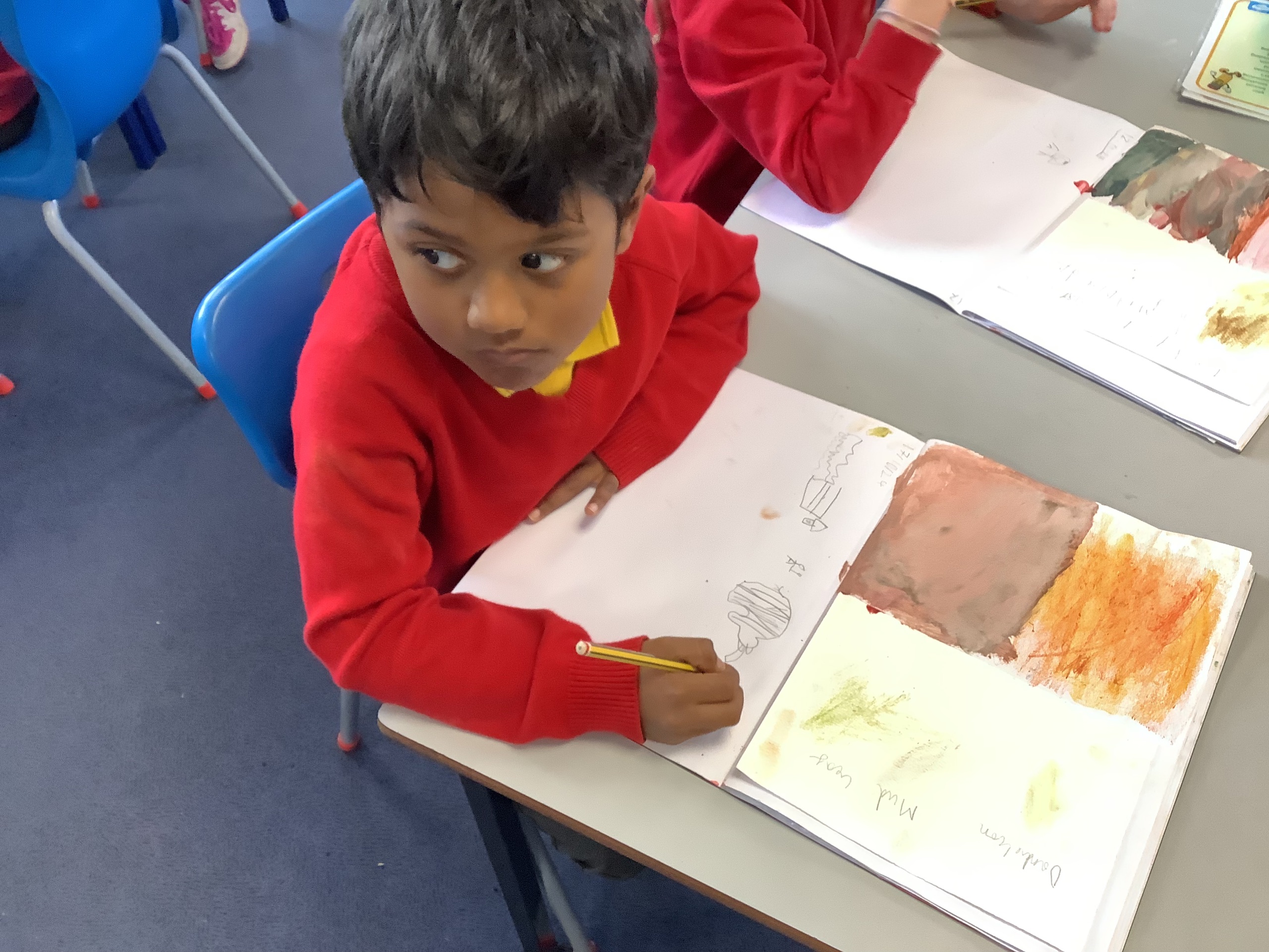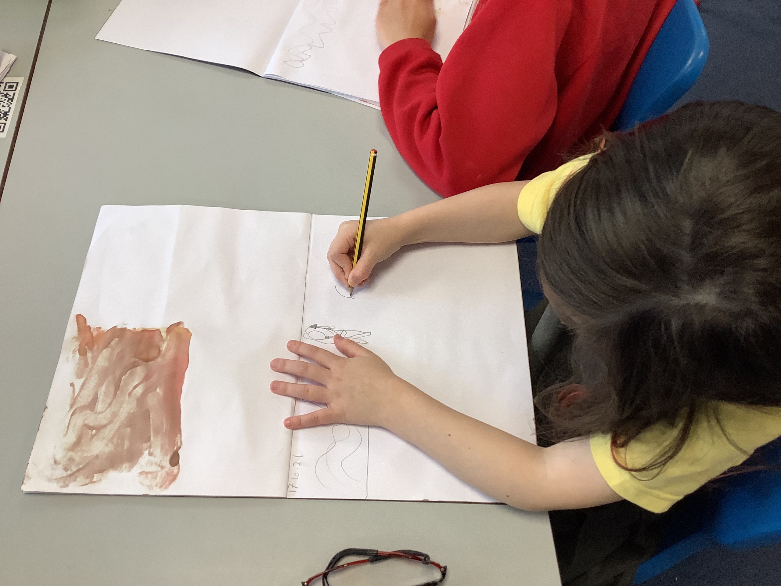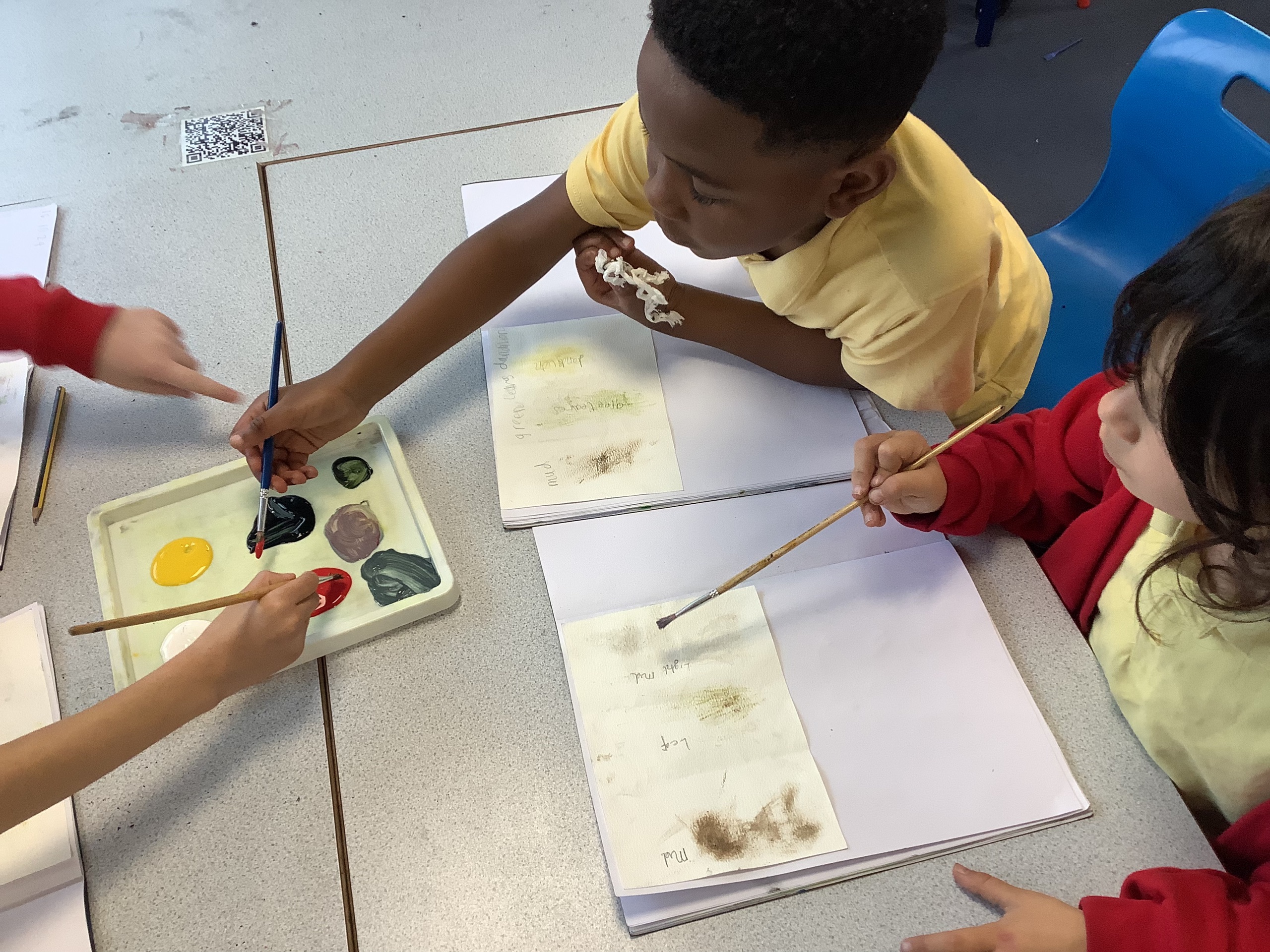 The next lesson, everyone spent time using paint and oil pastels to create natural colours. This was an experimental process to see what worked well as a background colour.
