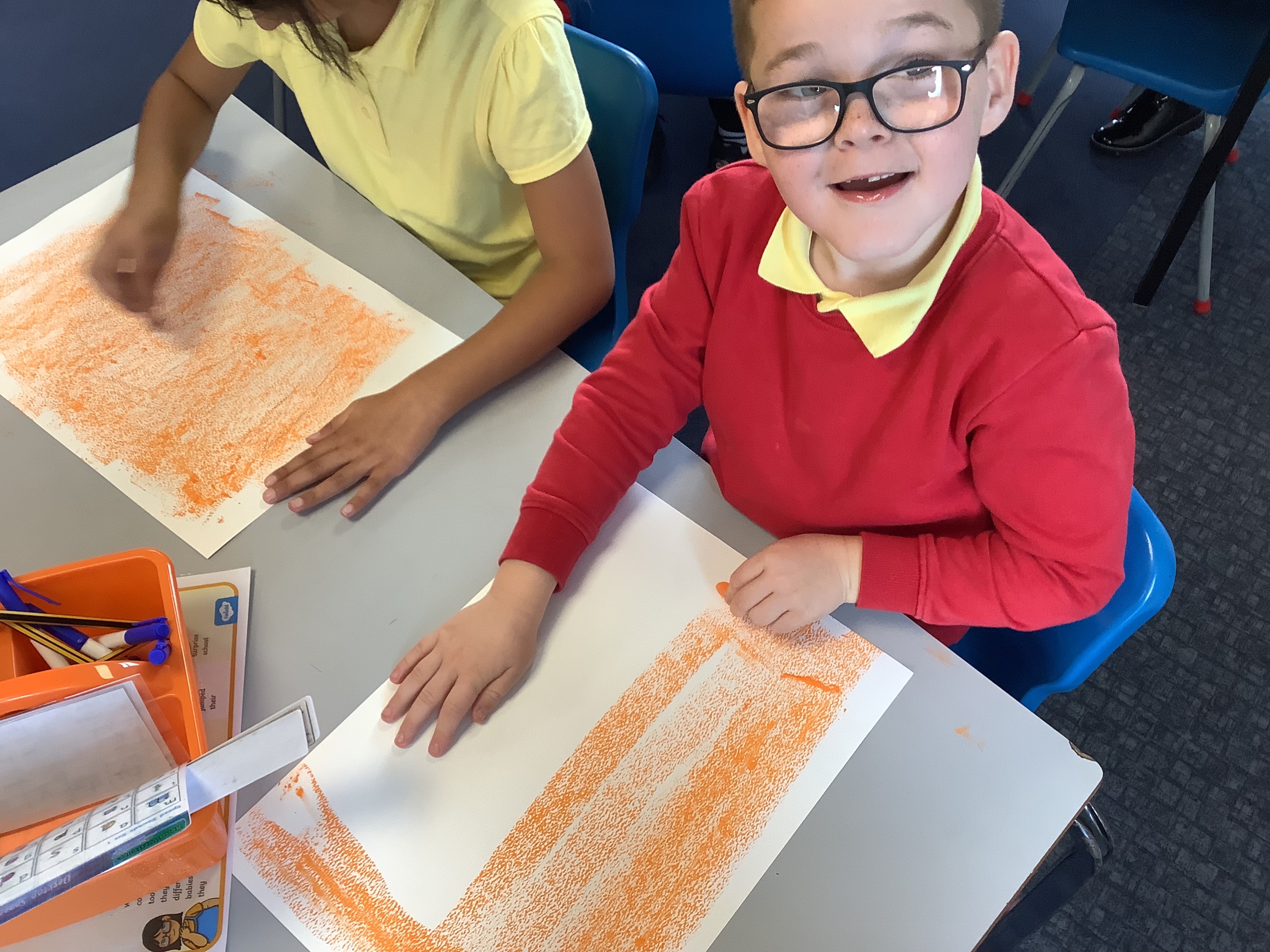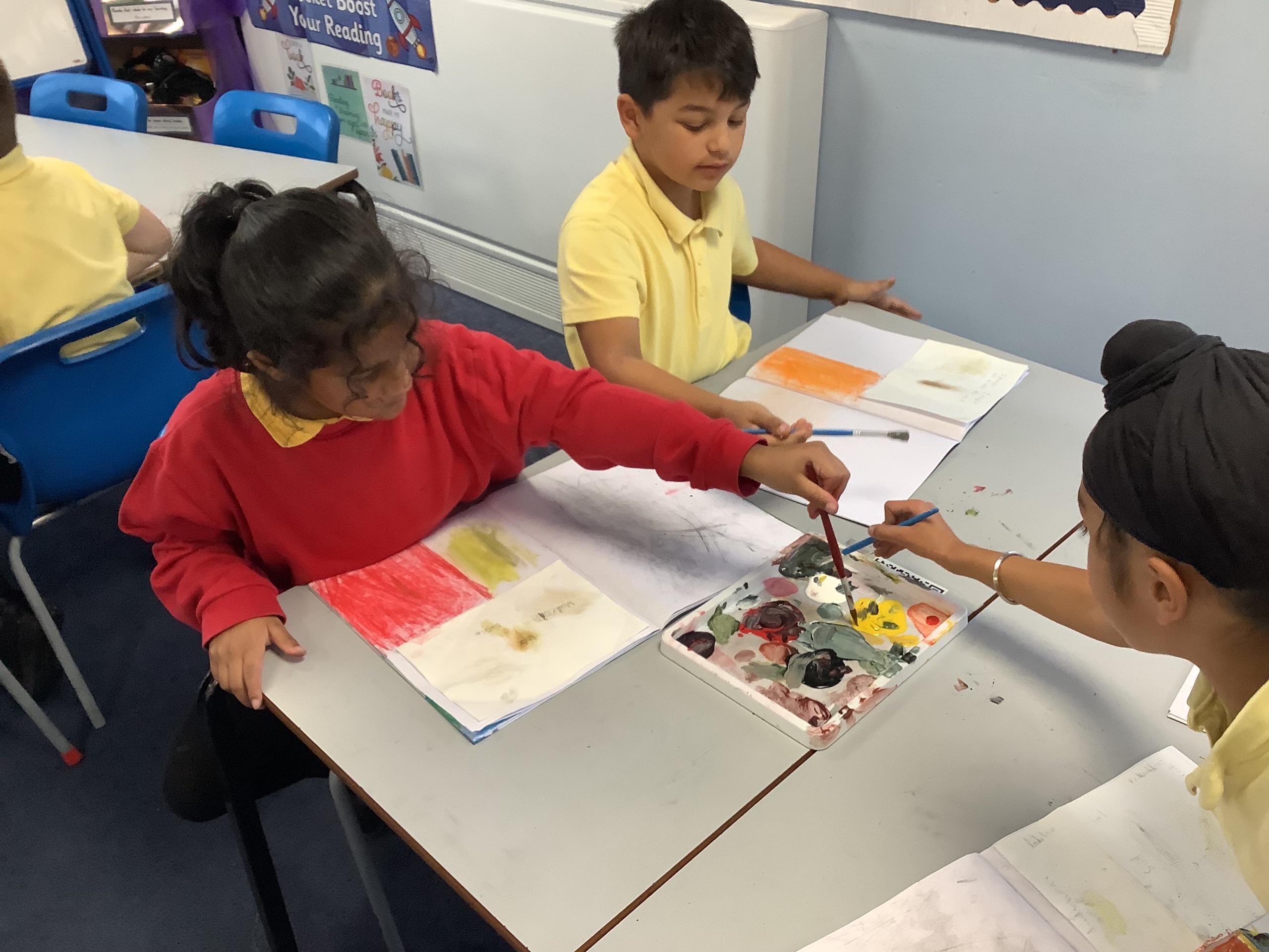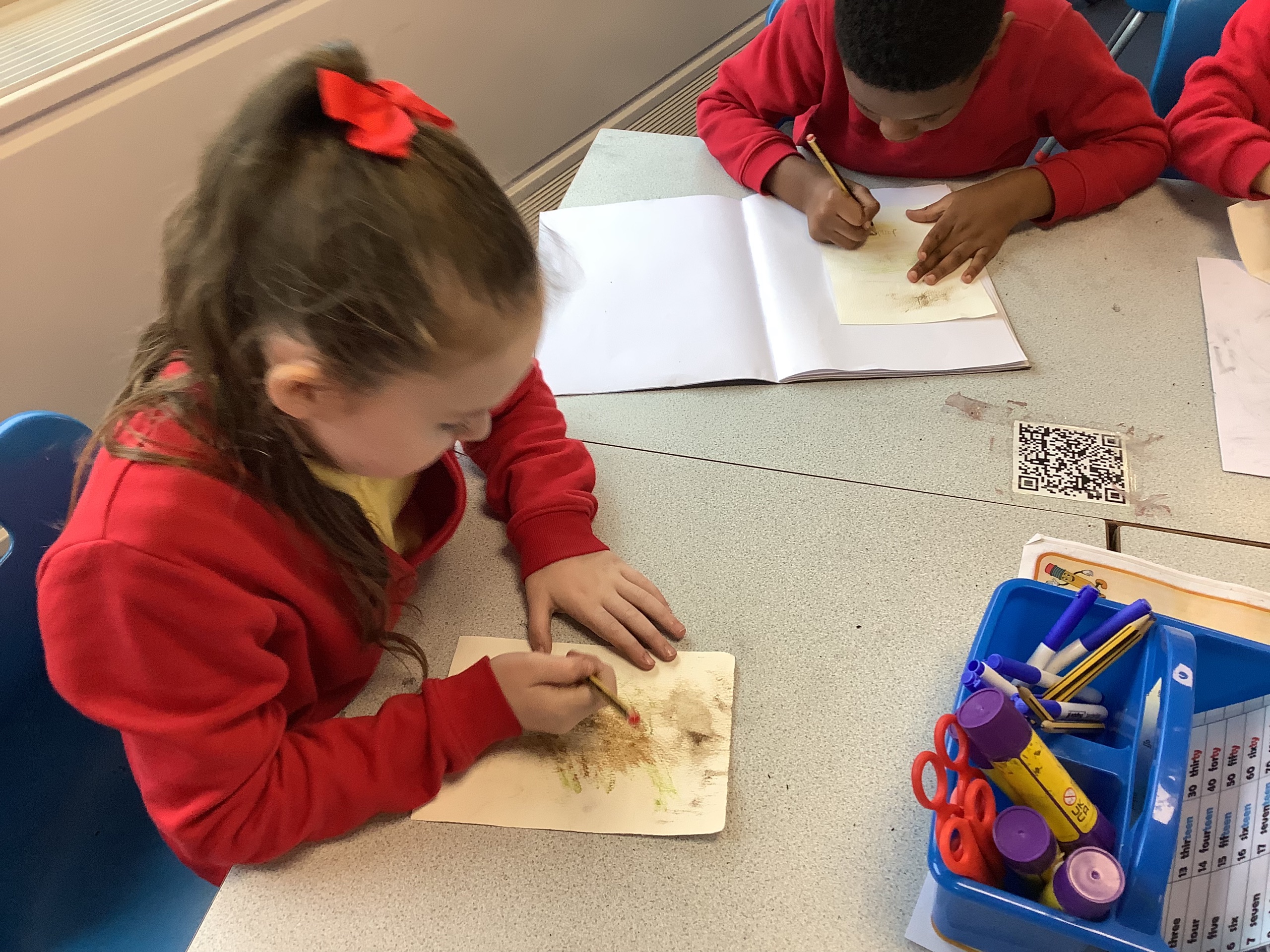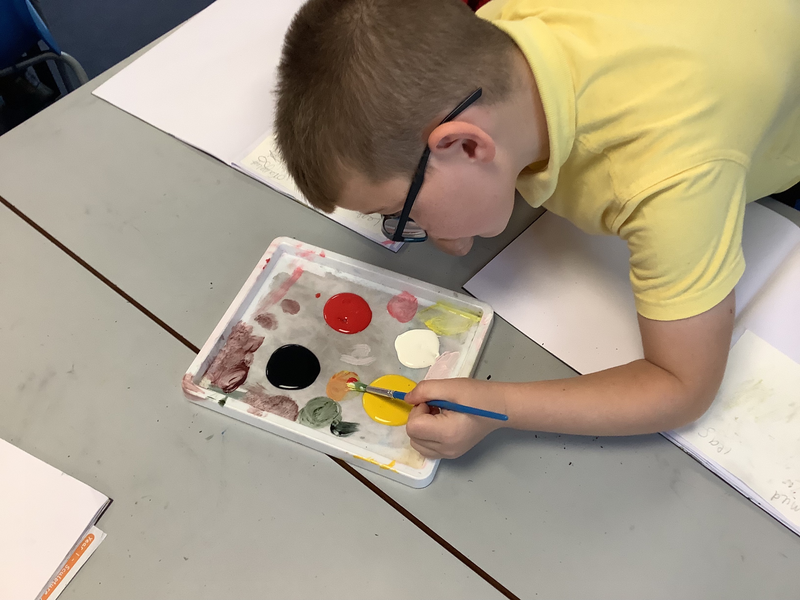 The next lesson, everyone spent time using paint and oil pastels to create natural colours. This was an experimental process to see what worked well as a background colour.