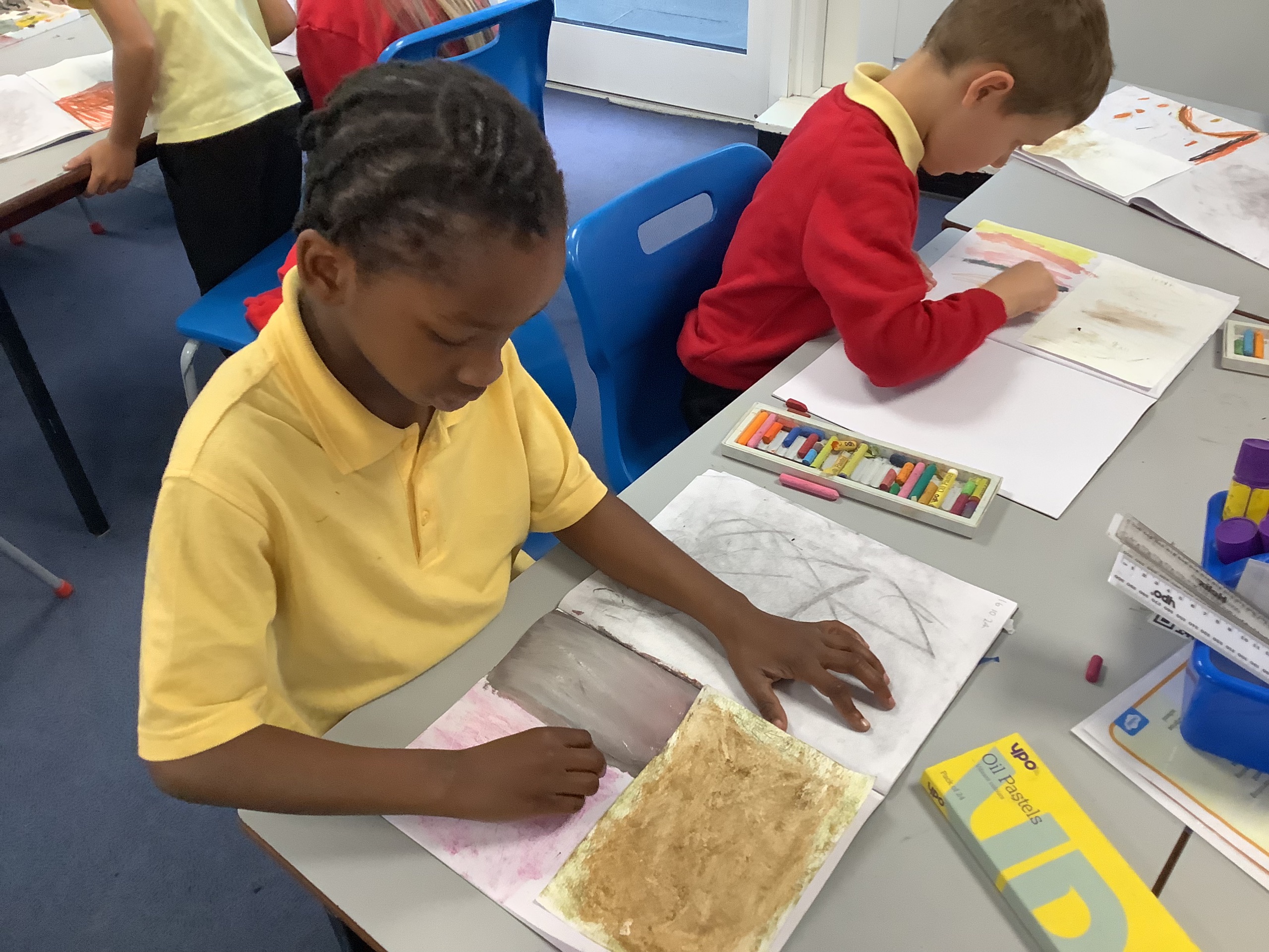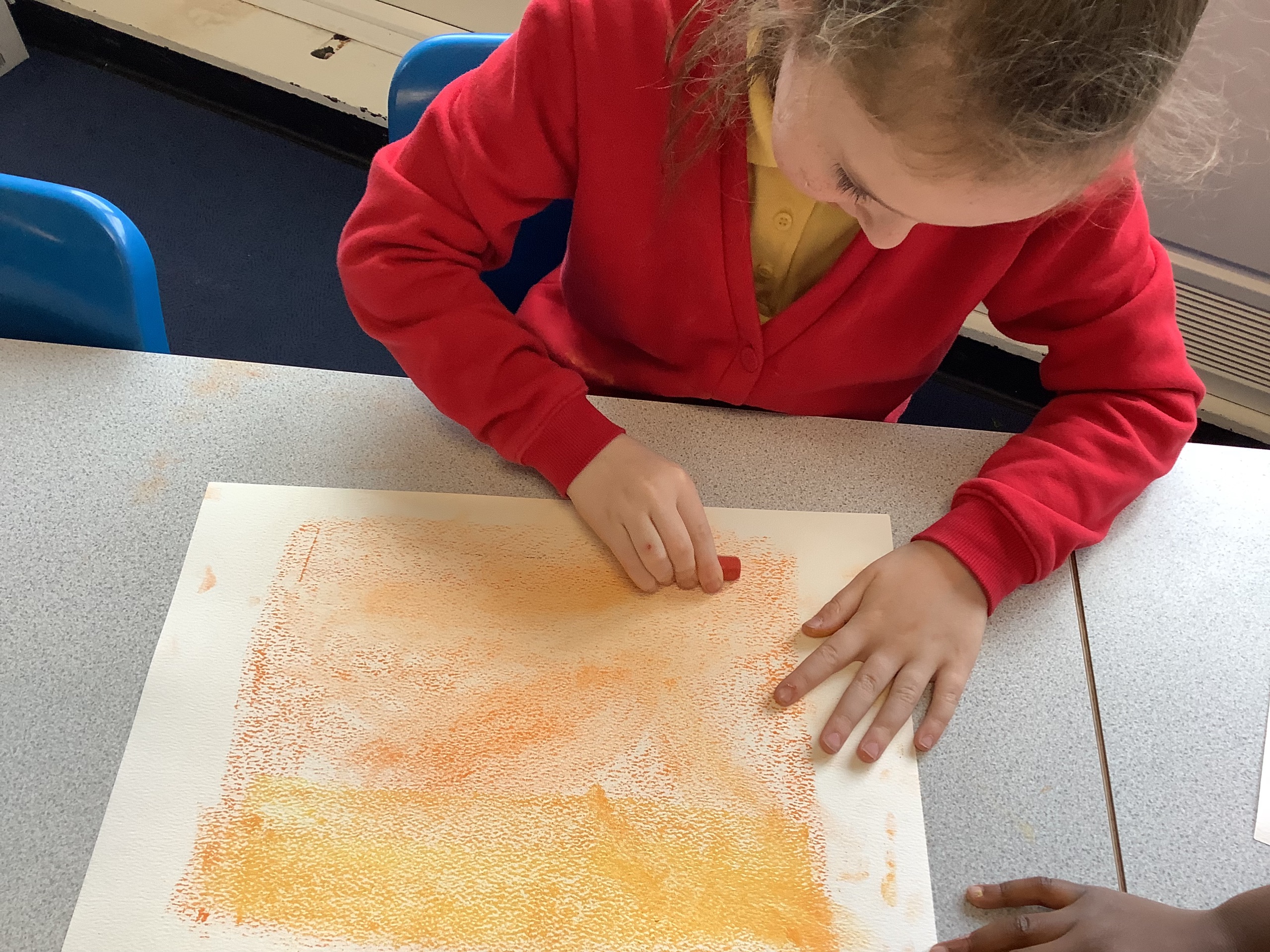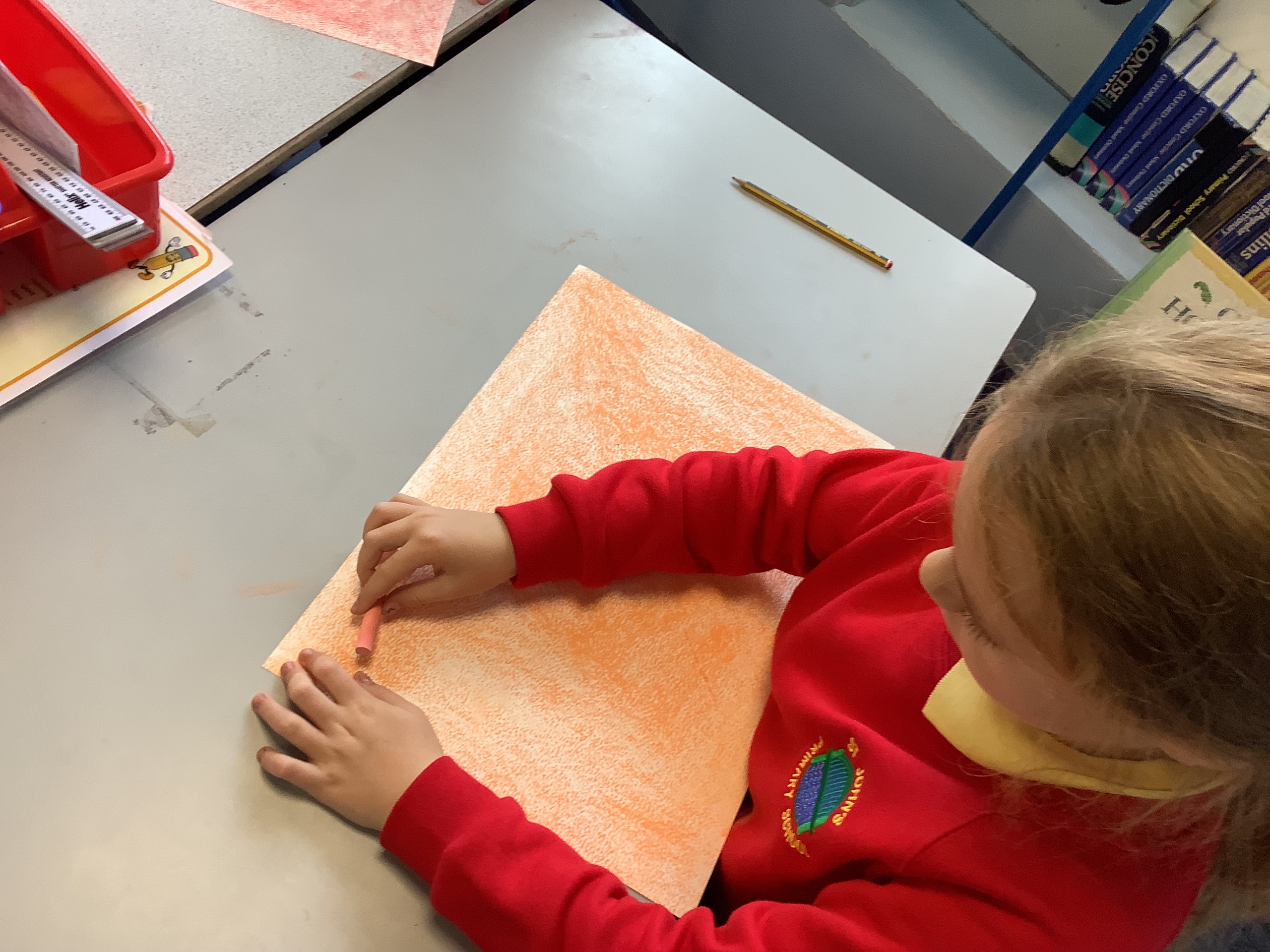 Then everyone made the background for their final piece, using natural colours of chalk. We held the chalk sideways and rubbed it against the textured paper to create the best effect.