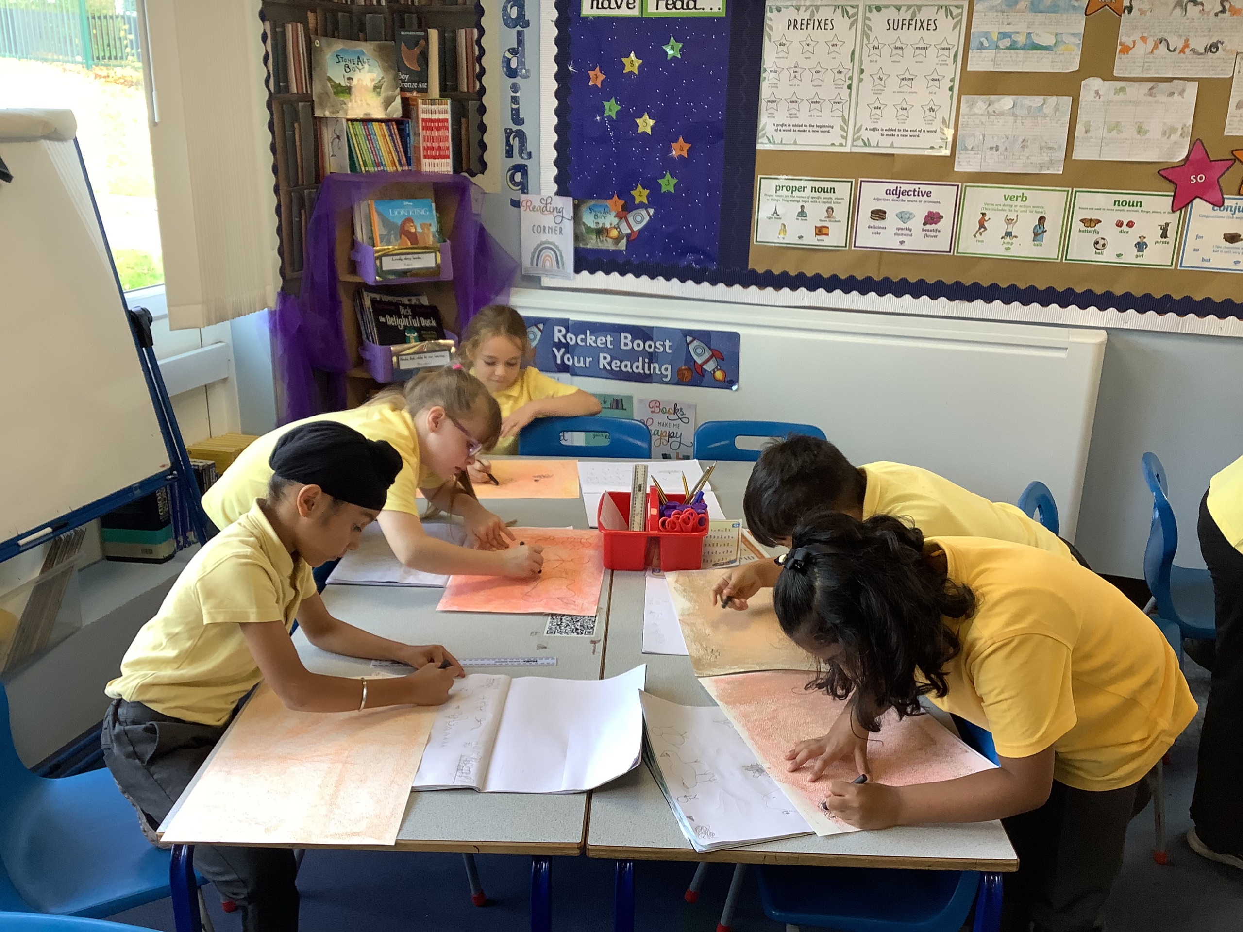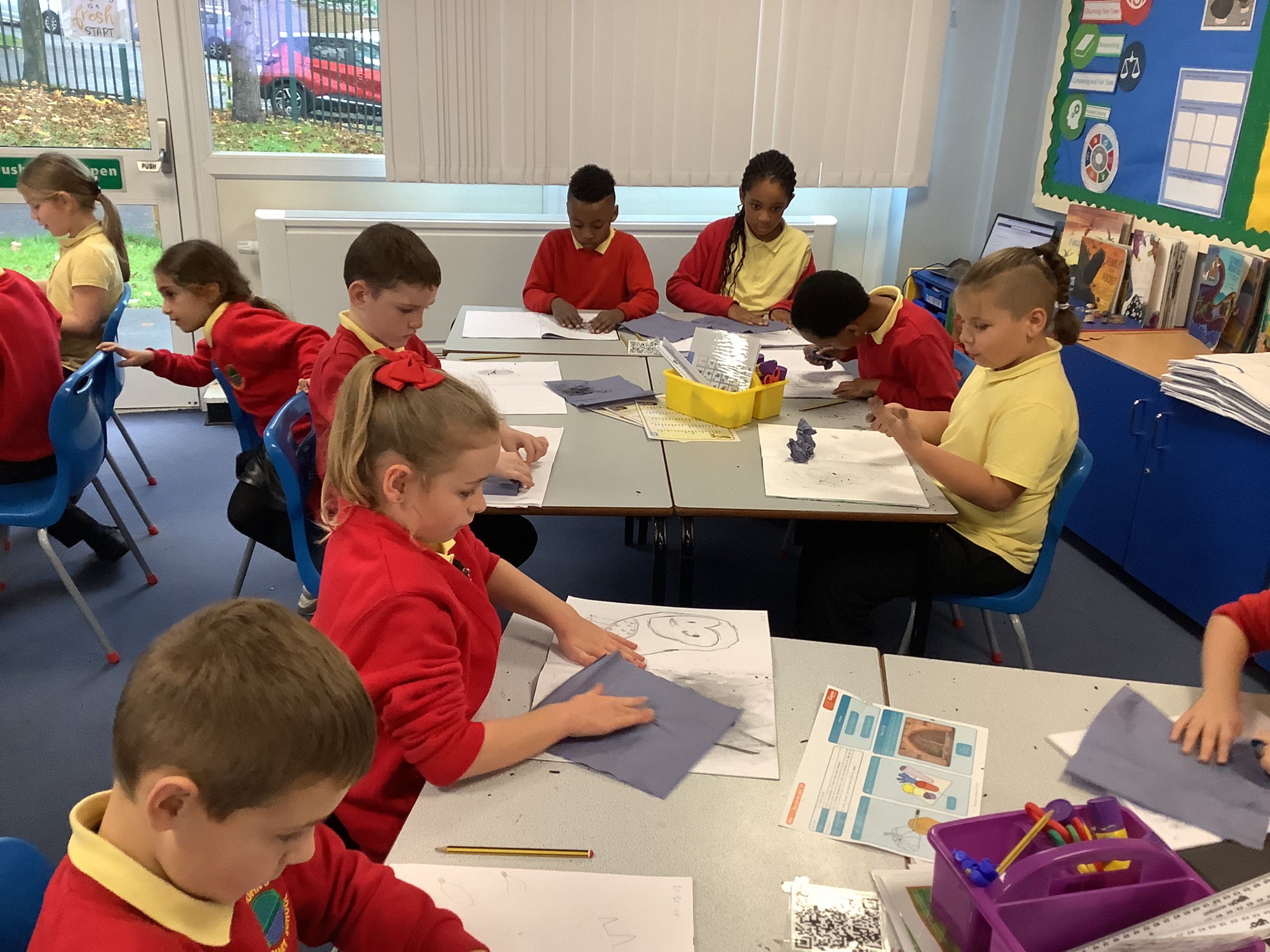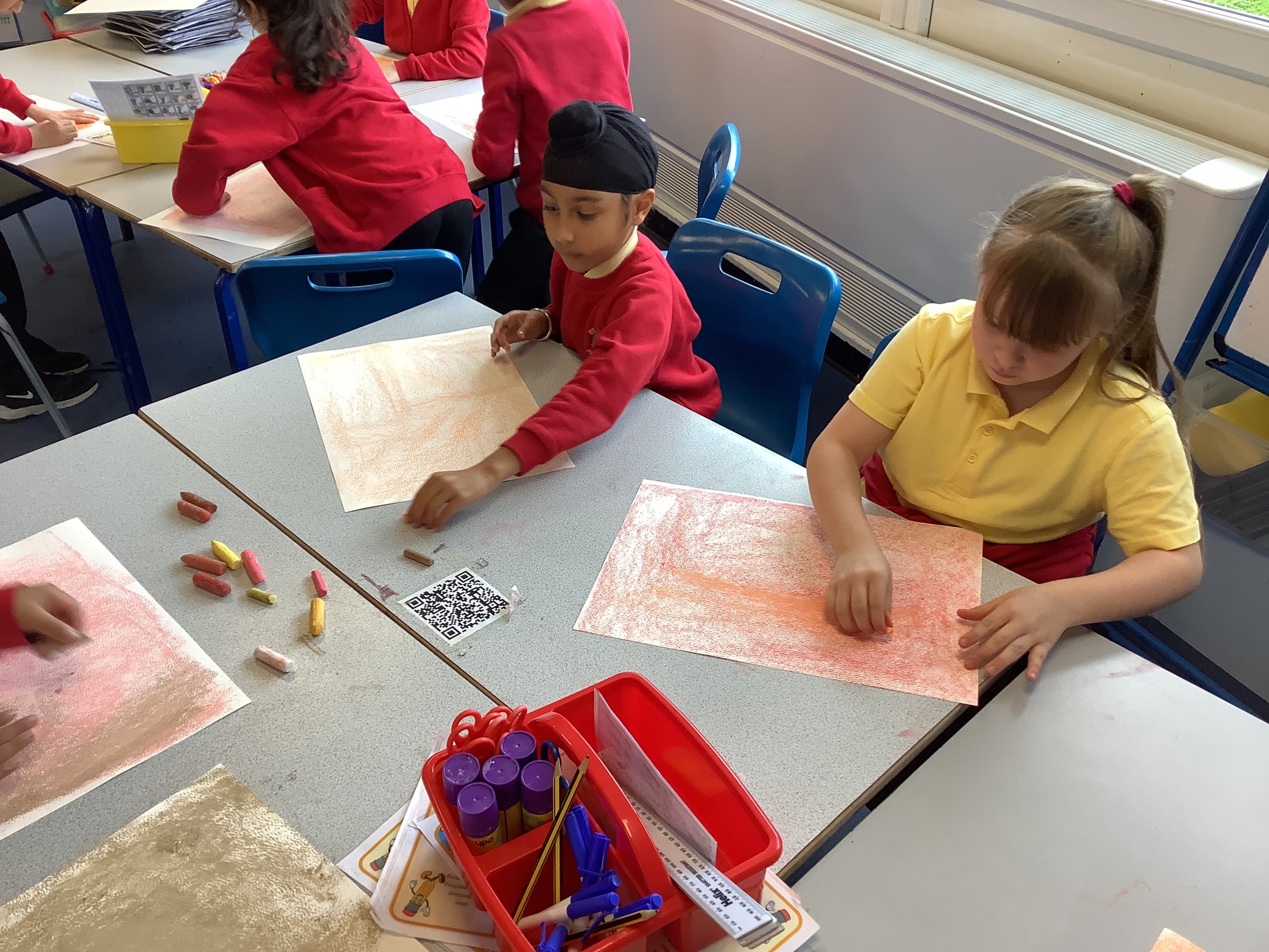 Then everyone made the background for their final piece, using natural colours of chalk. We held the chalk sideways and rubbed it against the textured paper to create the best effect.