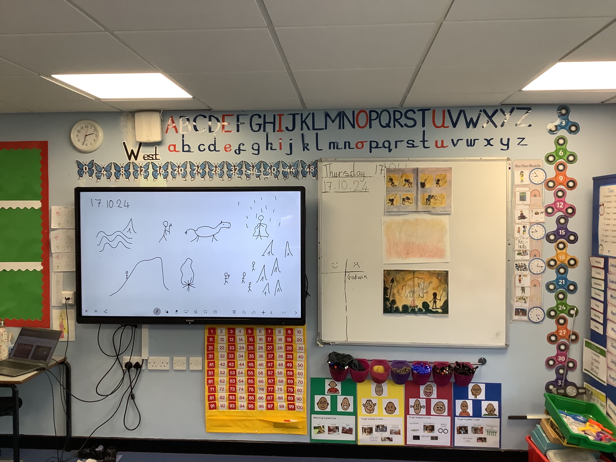 Finally, everyone used charcoal to draw their draft story onto the background they had created. This required a lot of concentration to use the materials correctly. The final cave paintings were fantastic!