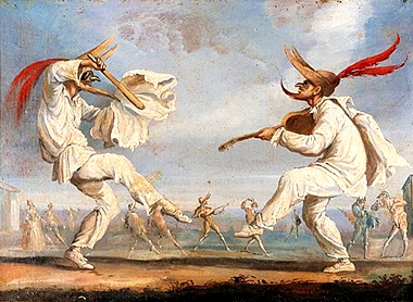 Slapping Lazzi- This is when a zanni is holding plates of food in his hands and slaps someone else with their foot.
