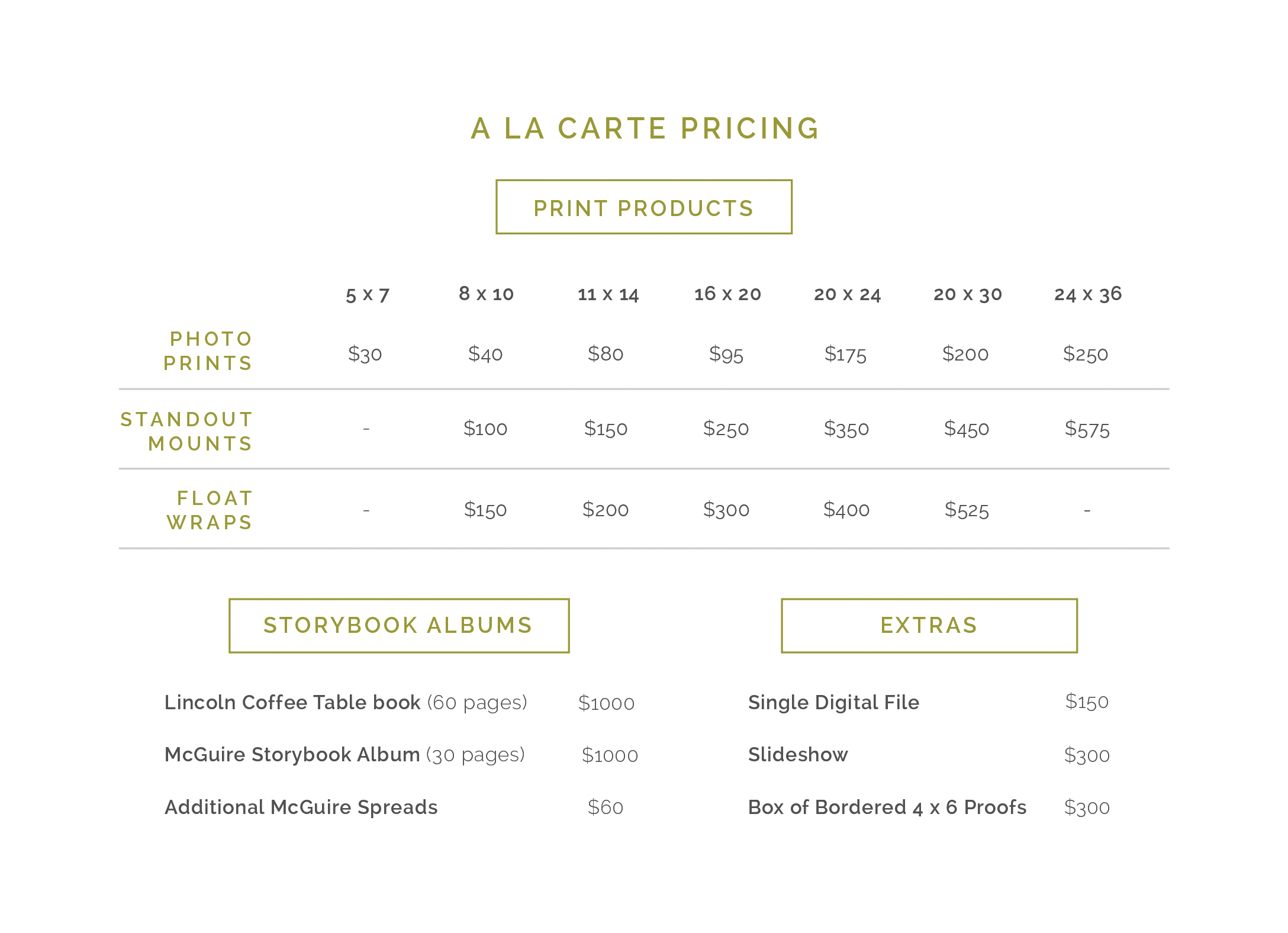 Payment of your booking deposit holds your date and includes a $200 credit toward your final order. It also includes a pre-session planning and prepping consultation, 1-2 super fun hours of shooting time with your immediate family, my selection and editing of the best images from your session and an (in person or online) ordering session. Digital files, prints and products can be purchased à la carte or as part of a collection. Keep scrolling to see the available collections and pricing.