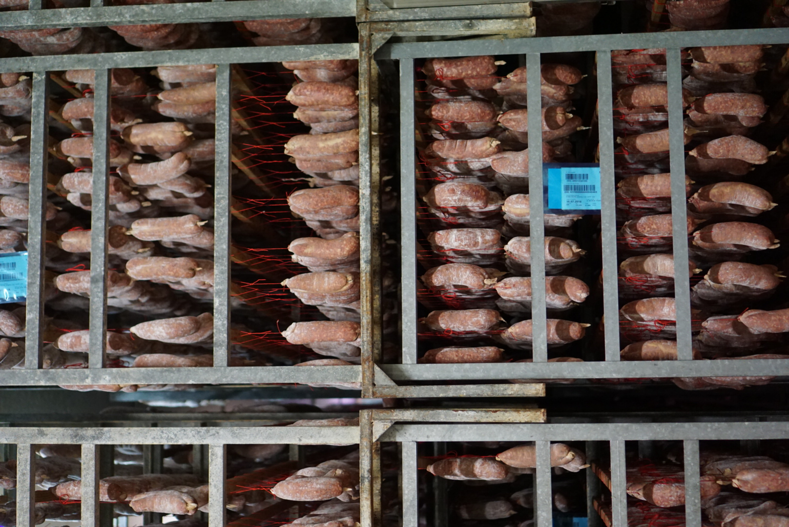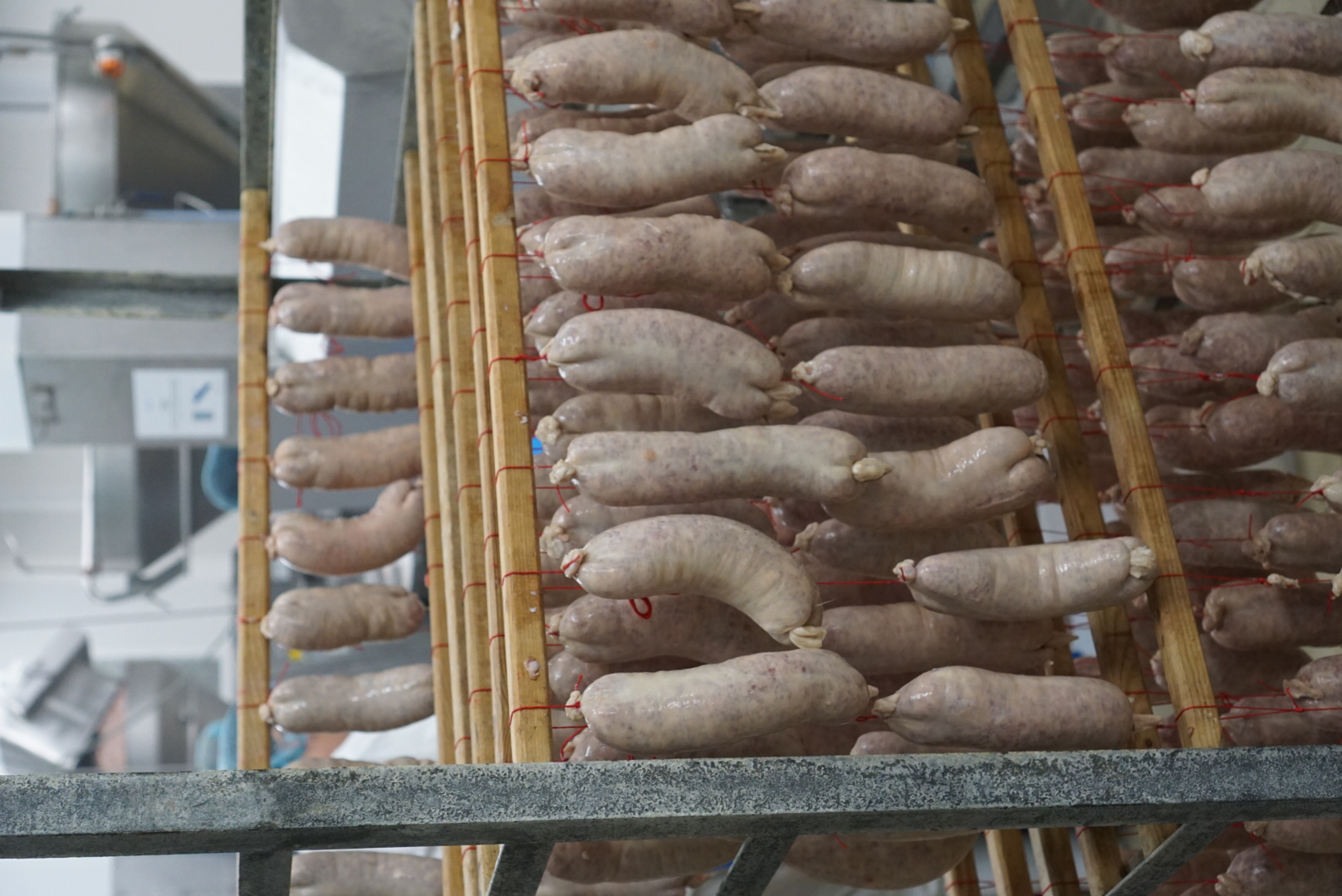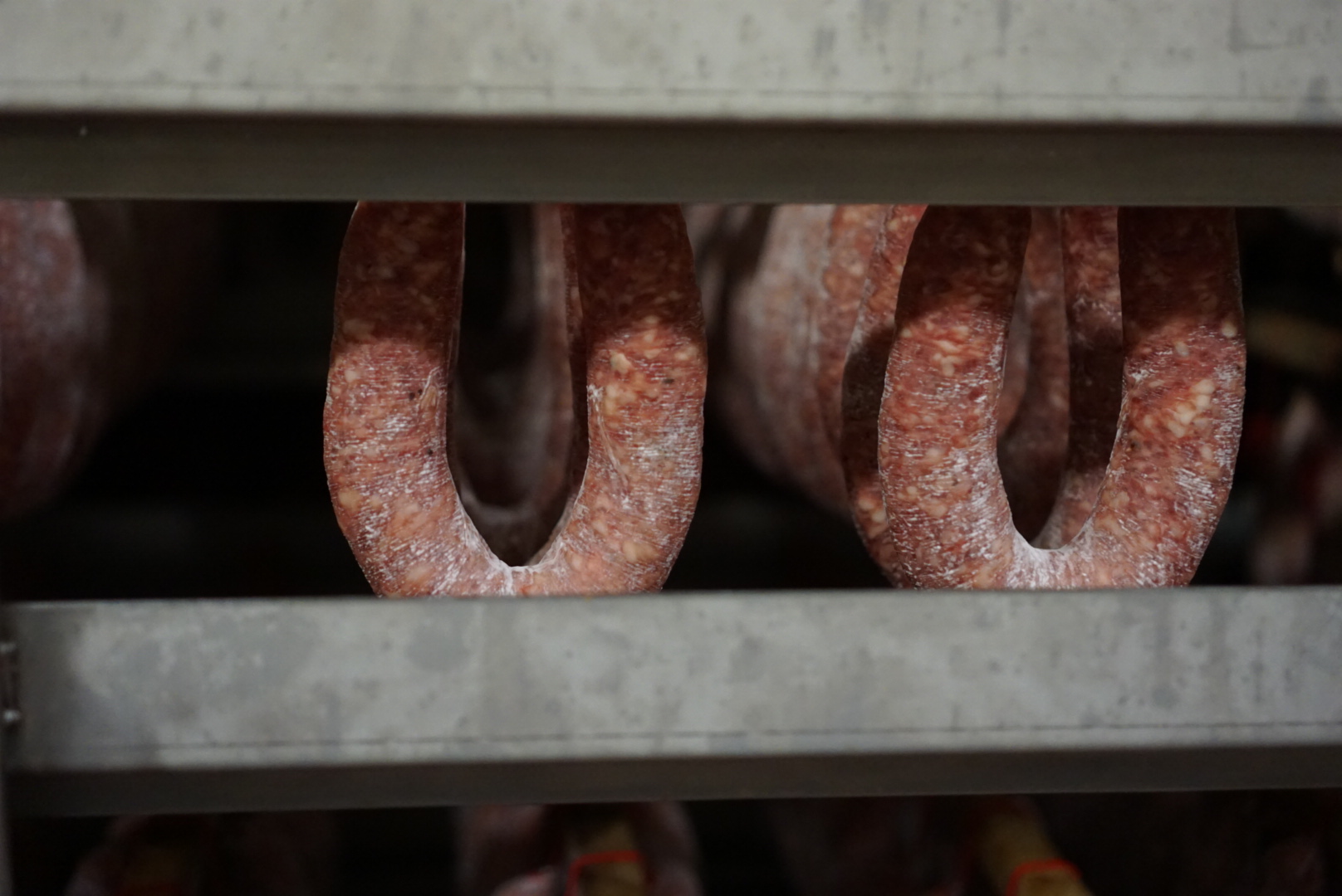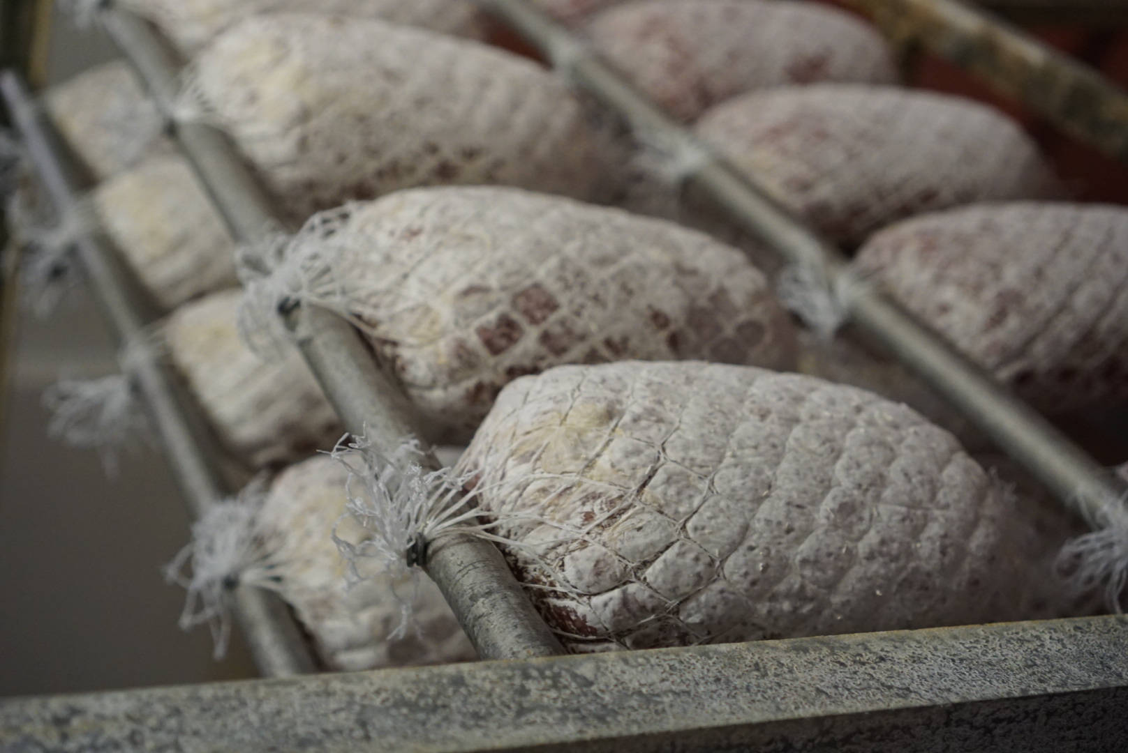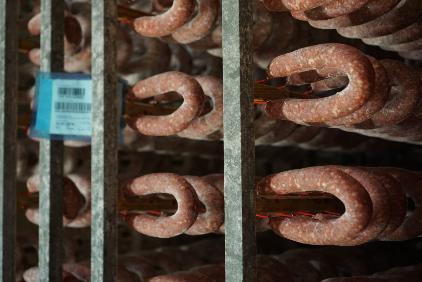 Am nächsten Tag wird das Brät in Form gebracht. Dabei kommen unterschiedliche Därme zum Einsatz: Dünndarm, Dickdarm und Collagendarm. Für die Ringsalami wird Dünndarm verwendet, für die Salami mit Oliven, MonOlive, der Collagendarm, und die besondere Form der Baguette-Salami wird ebenfalls mit Collagendarm hergestellt. Bis auf die Baguette-Salami werden alle anderen Salamis aufgehängt. Die Baguette-Salami wird, bis die Wurst fester gereift ist, liegend gereift, sonst geht die Form verloren (und gerade die Form ist ja passend für unsere Brotschnitten). Nachdem die Wurst hergestellt wurde, werden sie mit dem Edelschimmel besprüht. Und da kommt wieder die andere Sichtweise der Franzosen auf den Schimmel zum Tragen. Bruno, der Betriebsleiter, sprach immer wieder vom Penicillin, der so gute Arbeit für die Salami leistet. Penicillin, und auch Schimmel, sind bei uns so negativ besetzt, dass man schnell vergisst, das sie ja auch gute Sachen, in diesem Fall Geschmack und Konservierung, bewirken können. Durch den Edelschimmel wird nämlich verhindert, dass der „böse“ Schimmel, schwarz und grün, die Wurst befällt und damit die Wurst schlecht werden würde.