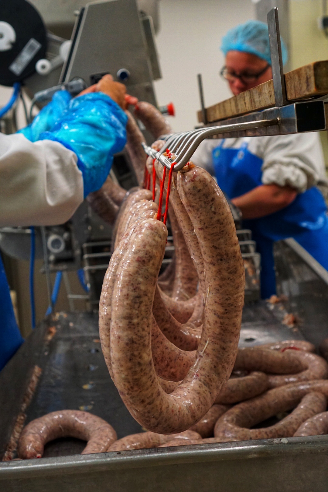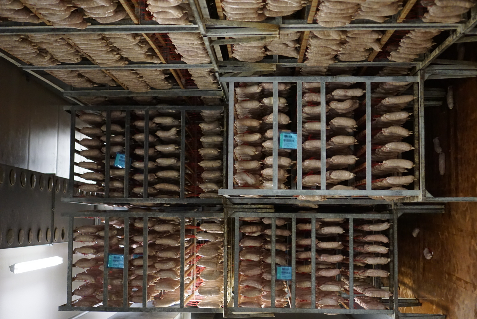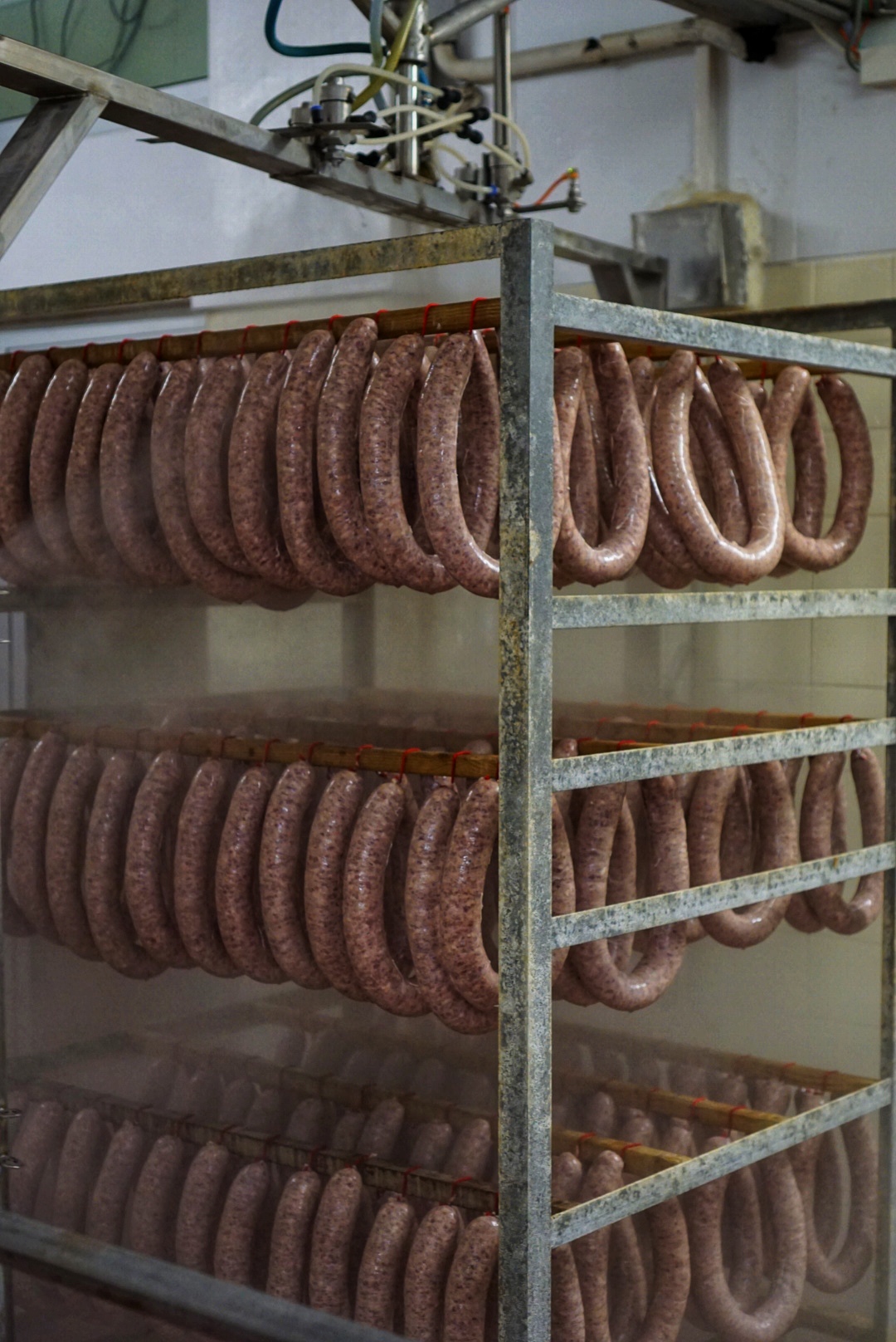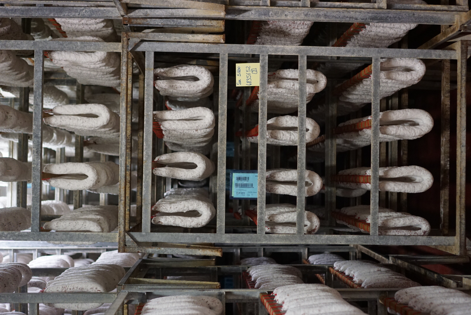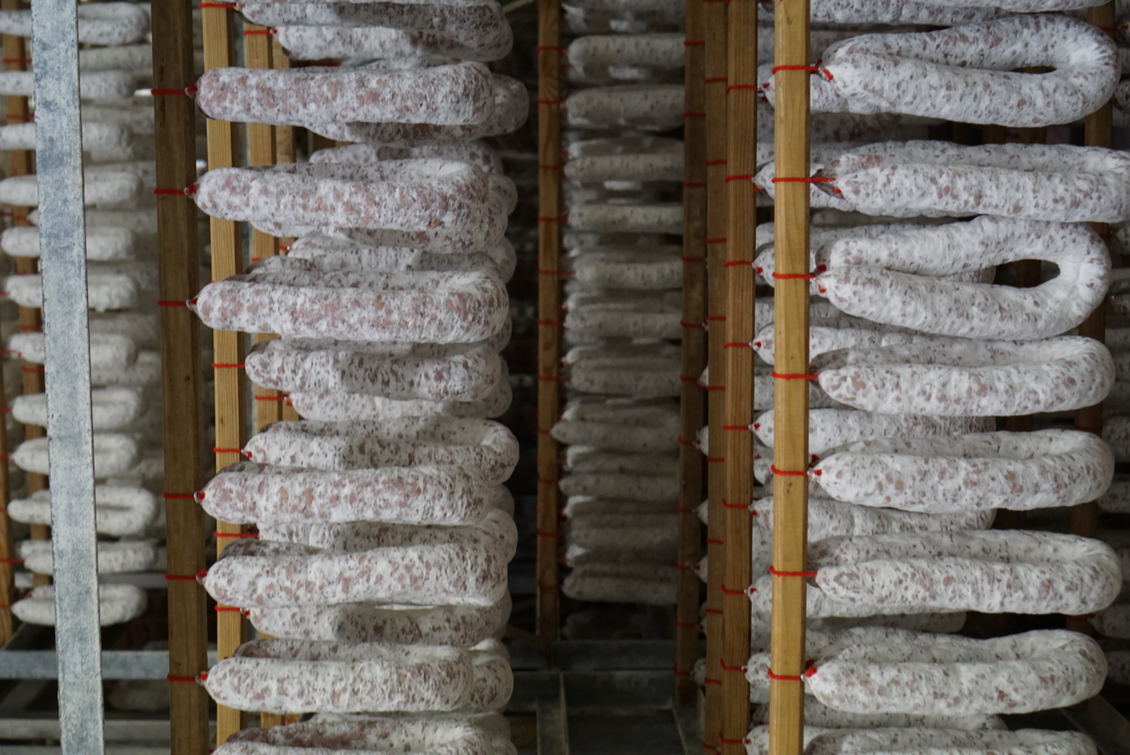 Am nächsten Tag wird das Brät in Form gebracht. Dabei kommen unterschiedliche Därme zum Einsatz: Dünndarm, Dickdarm und Collagendarm. Für die Ringsalami wird Dünndarm verwendet, für die Salami mit Oliven, MonOlive, der Collagendarm, und die besondere Form der Baguette-Salami wird ebenfalls mit Collagendarm hergestellt. Bis auf die Baguette-Salami werden alle anderen Salamis aufgehängt. Die Baguette-Salami wird, bis die Wurst fester gereift ist, liegend gereift, sonst geht die Form verloren (und gerade die Form ist ja passend für unsere Brotschnitten). Nachdem die Wurst hergestellt wurde, werden sie mit dem Edelschimmel besprüht. Und da kommt wieder die andere Sichtweise der Franzosen auf den Schimmel zum Tragen. Bruno, der Betriebsleiter, sprach immer wieder vom Penicillin, der so gute Arbeit für die Salami leistet. Penicillin, und auch Schimmel, sind bei uns so negativ besetzt, dass man schnell vergisst, das sie ja auch gute Sachen, in diesem Fall Geschmack und Konservierung, bewirken können. Durch den Edelschimmel wird nämlich verhindert, dass der „böse“ Schimmel, schwarz und grün, die Wurst befällt und damit die Wurst schlecht werden würde.