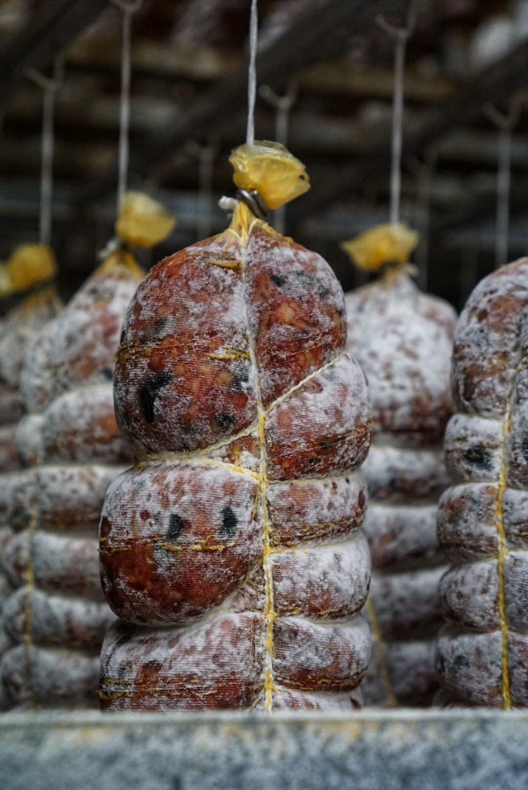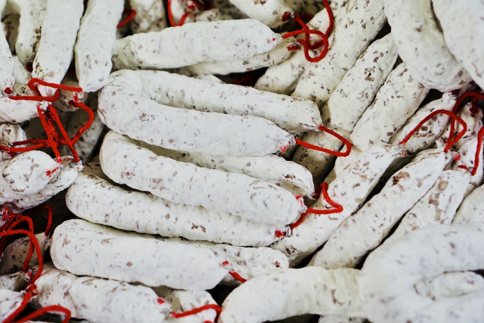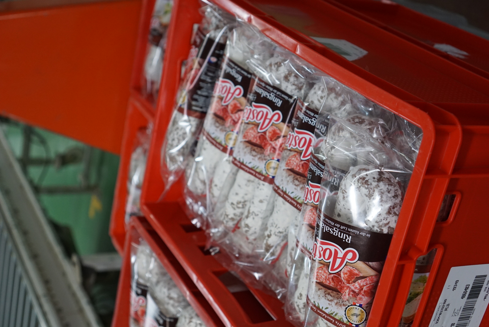 Für die Aoste Baguette- und Ring-Salami wird Schweinefleisch verwendet. Dabei kommt Fleisch von sechs Monate alten Schweinen zum Einsatz, für manche Produkte aber vor allem auch von vier bis fünf Jahre alten Sauen. Gerade letzteres trägt deutlich zum guten Geschmack bei. Verwendet werden ganze Muskeln und natürlich der Schinken des Schweins. Als Fett kommt Rücken- oder Bauchspeck in die Wurst. Der Speck ist auch der einzige Part, der tiefgefroren wird, da er sich so besser wollen lässt. Alle anderen Fleischstücke sind gekühlt und werden frisch angeliefert.