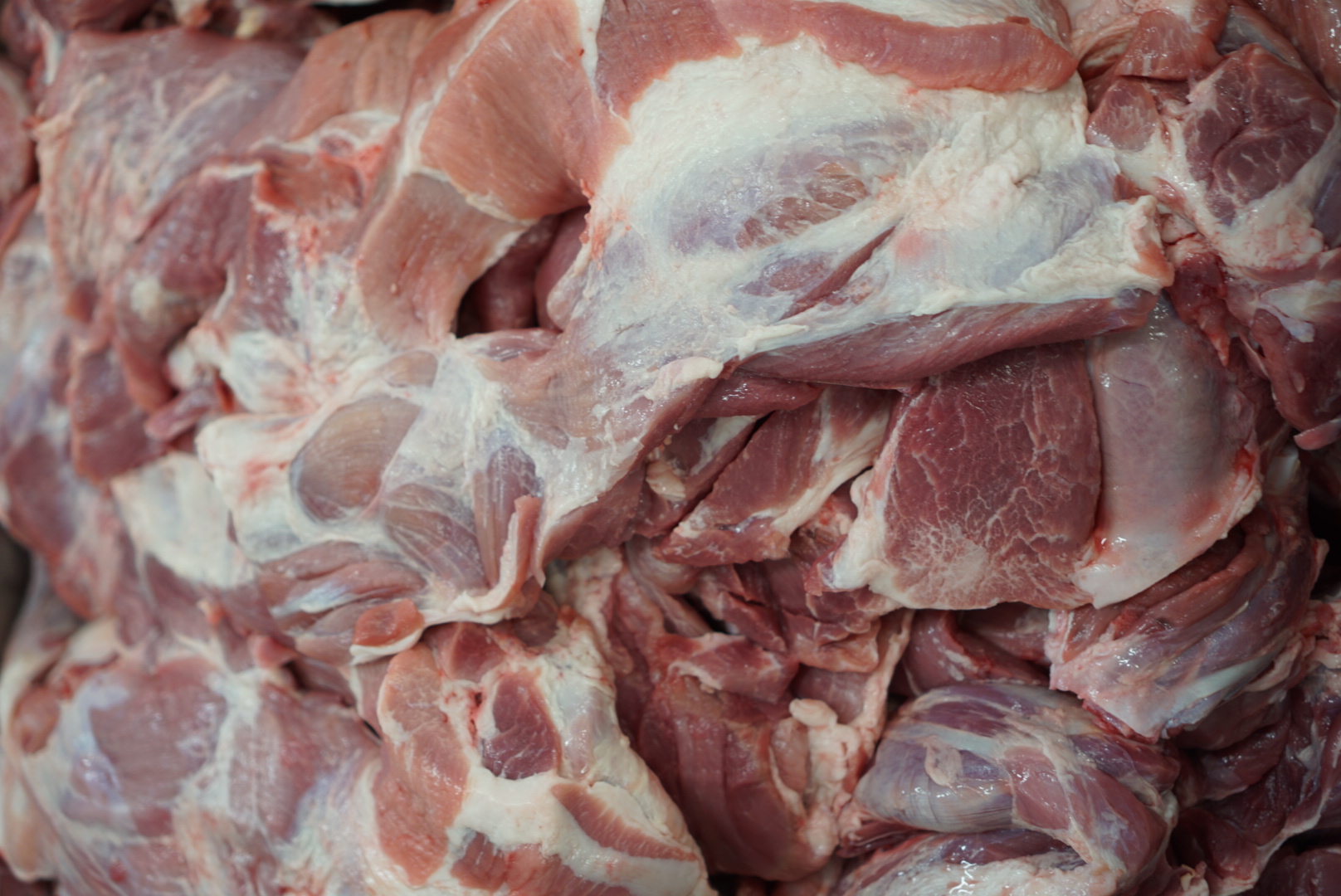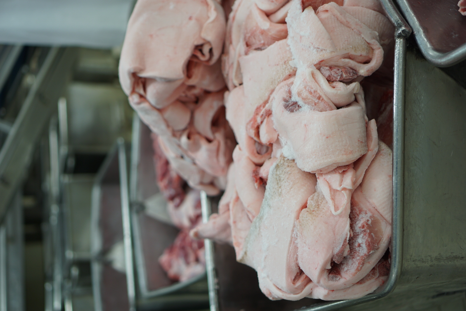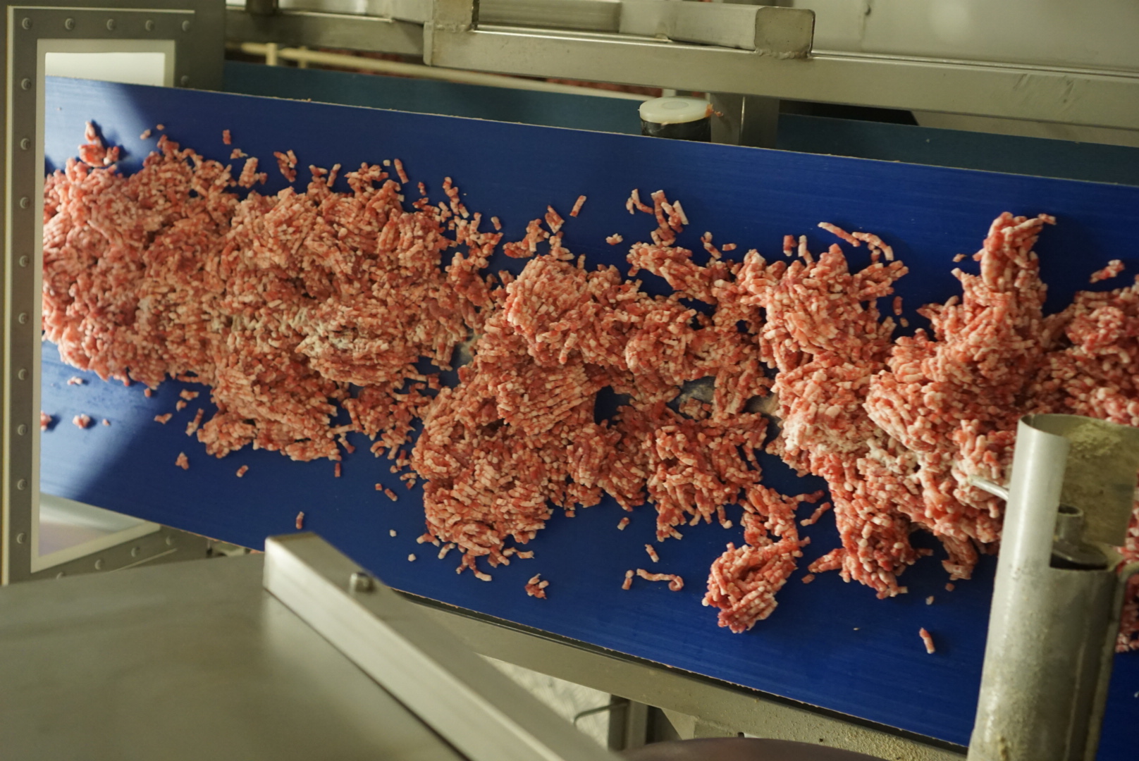 Für die Aoste Baguette- und Ring-Salami wird Schweinefleisch verwendet. Dabei kommt Fleisch von sechs Monate alten Schweinen zum Einsatz, für manche Produkte aber vor allem auch von vier bis fünf Jahre alten Sauen. Gerade letzteres trägt deutlich zum guten Geschmack bei. Verwendet werden ganze Muskeln und natürlich der Schinken des Schweins. Als Fett kommt Rücken- oder Bauchspeck in die Wurst. Der Speck ist auch der einzige Part, der tiefgefroren wird, da er sich so besser wollen lässt. Alle anderen Fleischstücke sind gekühlt und werden frisch angeliefert.