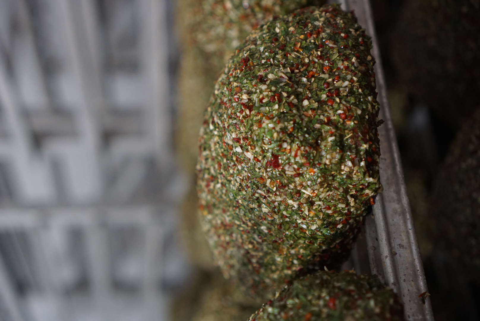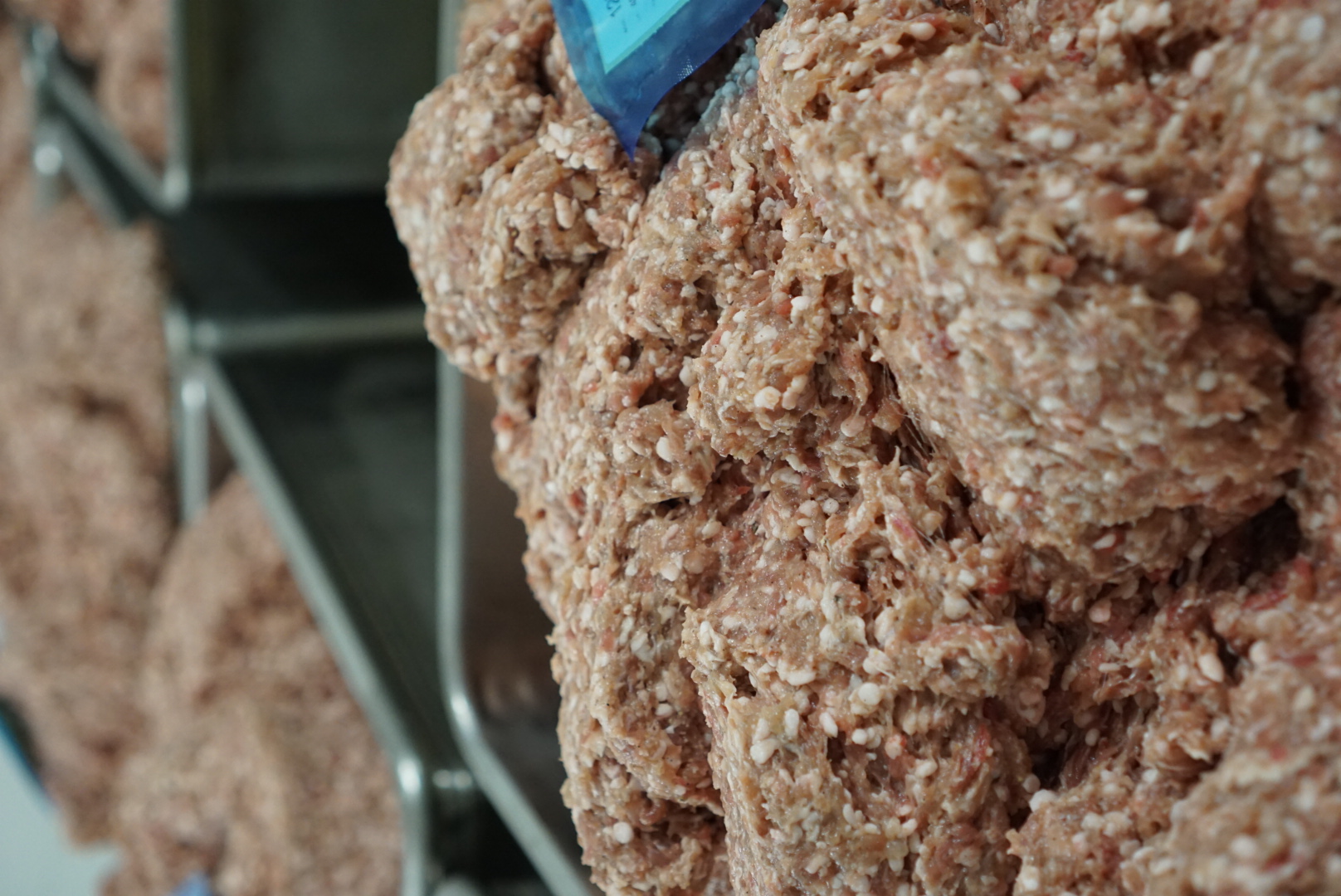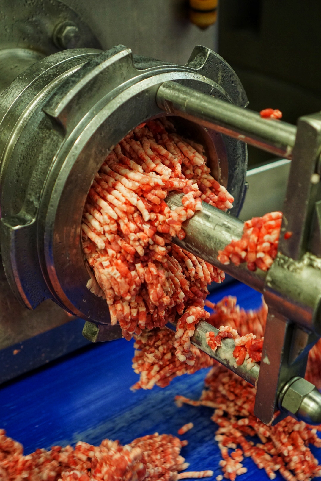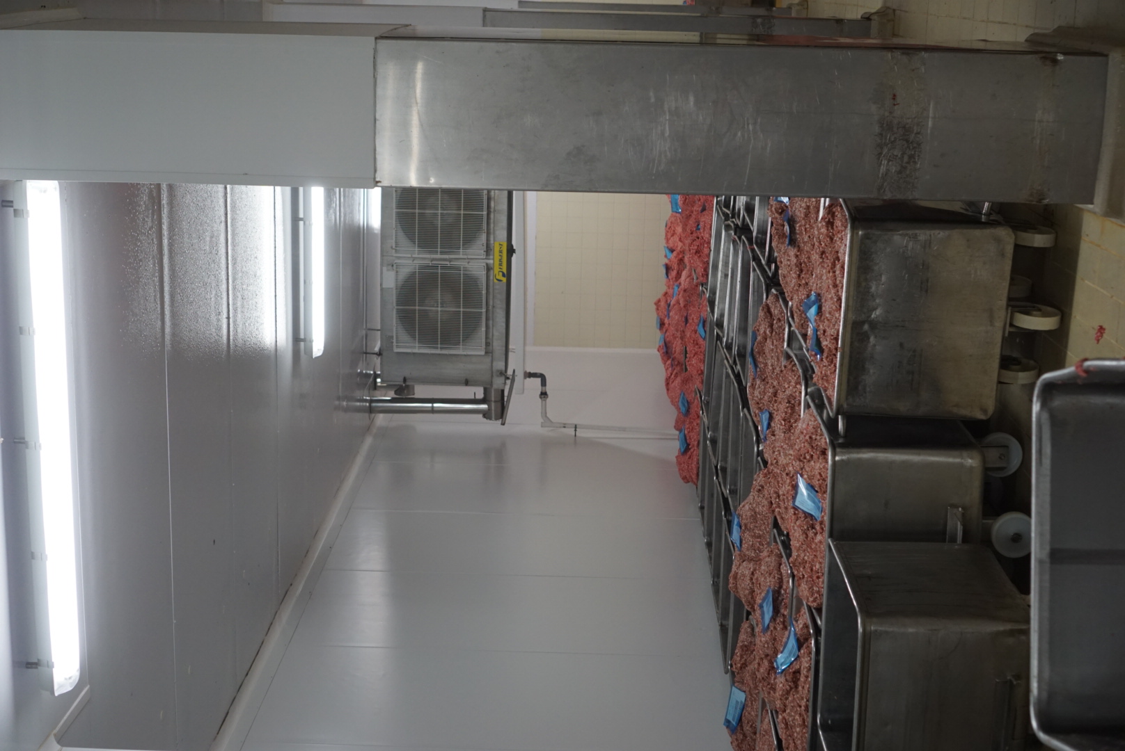 Das Fleisch wird unterschiedlich gewolft. Wir Deutschen stehen auf feinere Salami, ohne große Stücke darin, während die Franzosen gerade dies sehr schätzen. Je nachdem für welches Land gerade produziert wird, wird unterschiedlich gewolft. Da ich mir ja die Produktion der Aoste Baguette- und Ringsalami angeschaut habe, wurde natürlich für den deutschen Geschmack gewolft. Danach wird das Brät mit Gewürzen versetzt, die vor Ort erst zusammengestellt werden. Es gibt einen großen Gewürzraum und der Geruch darin ist atemberaubend intensiv. Man riecht Macis, Pfeffer und diverse andere Gewürze. Neben den Gewürzen und Salz kommen auch Lactobazillen zum Einsatz. Die verhindern durch ihre Arbeit, dass andere Bakterien (z.B. Salmonellen) ihr Unwesen in der Wurst treiben können. Das Brät wird zum Ruhen 24 Stunden kalt gestellt und danach weiter verarbeitet.