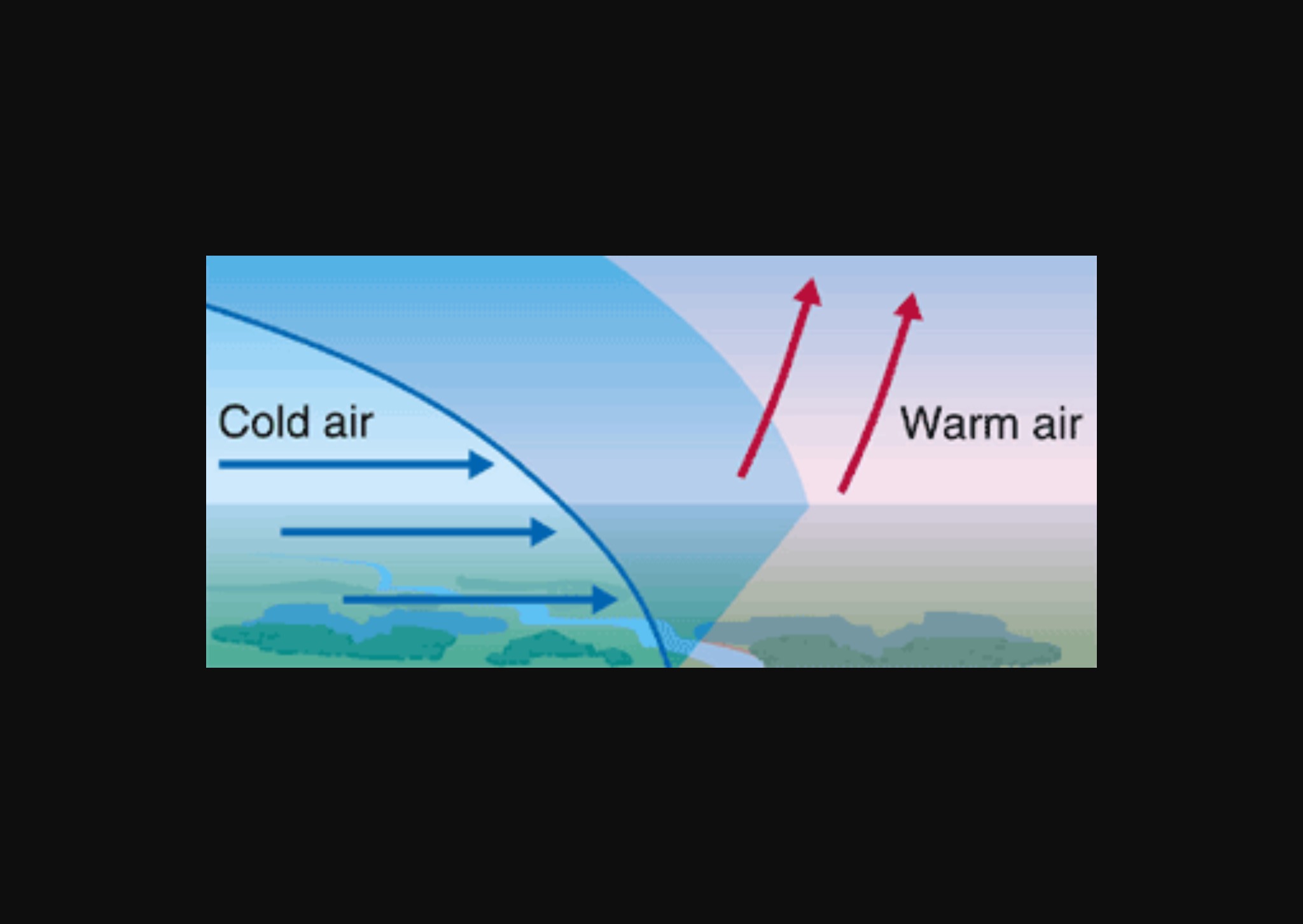 A cold front is when the boundary of an advancing mass of cold air (high-pressure system) and the warm air (low-pressure system) meet but don't crossover and the cold air pushes and forces the warm air up. A cold front is defined as the transition zone. Cold fronts generally move from northwest to southeast.