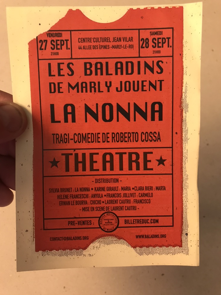 Nous avons joué « La Nonna » à Chavenay, Marly-le-Roi, La-Celle-St-Cloud, Mesnil-le-Roi, Mamers, Clermont-Ferrand, Maromme, Thonon-les-Bains, Houdan, Breuillet, Longpont/Orge, Triel/Seine, Aurillac, Châtillon-sur-Chalaronne, Narbonne, Marlow-on-Thames (UK).