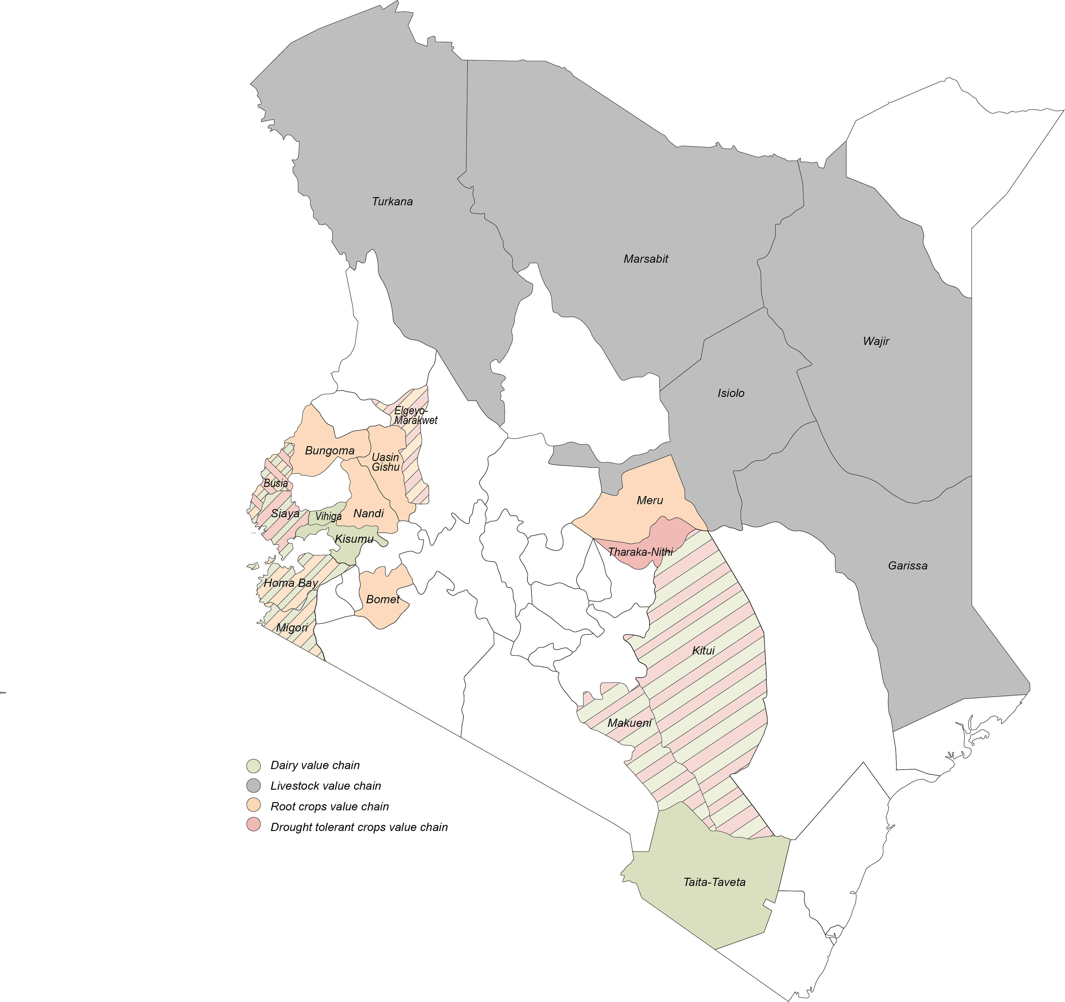 The Feed the Future Kenya Accelerated Value Chain Development seeks to widely apply technologies and innovations for selected value chains in order to competitively and sustainably increase productivity, contributing to inclusive agricultural growth, nutrition and food security in the country. The program’s main goal is to sustainably reduce poverty and hunger in the Feed the Future zones of influence in Kenya.