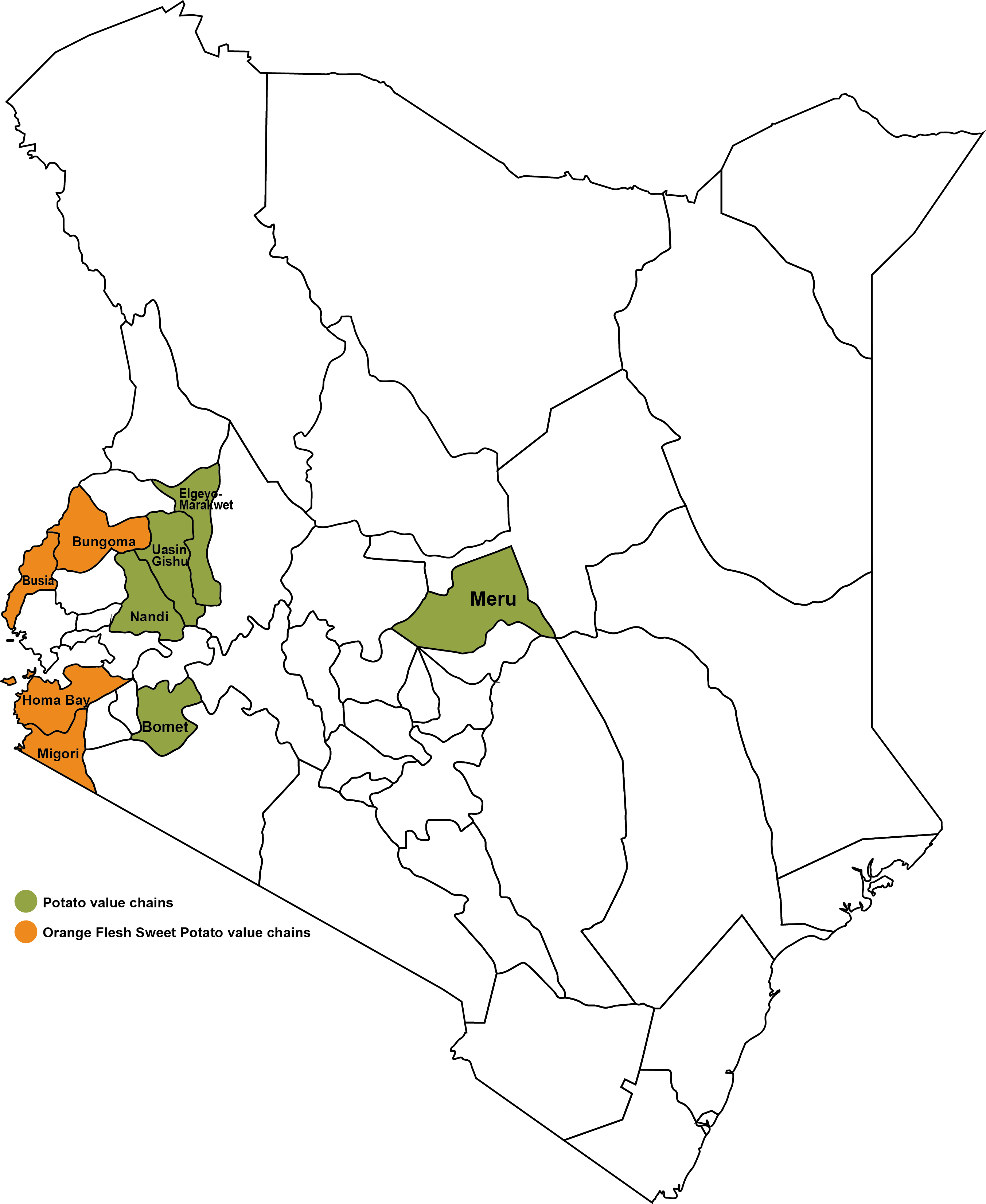 The potato value chain aims to reach at least 35,000 households in Kenya with high-quality seed of improved potato varieties to increase income from potato production by at least 20% and value of sales by 30%. The sweetpotato value chain will reach at least 65,000 households with children under five in western Kenya with productive and nutritious OFSP varieties and nutrition education. Approximately 50 percent of the households will receive support with postharvest utilization, storage and marketing to increase the value of sweetpotato sales by at least 15%.