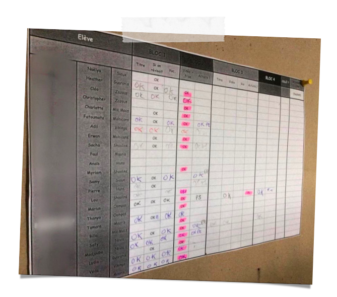 Les élèves indiquent leur progression, le professeur précise la validation ave un feutre.