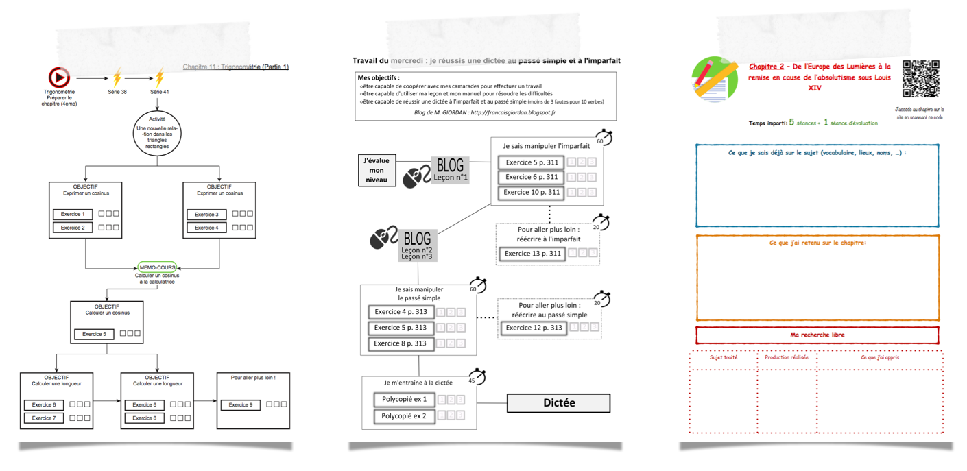 Trois exemples de plan de travail en mathématiques (à gauche), français (au centre), histoire (à droite)