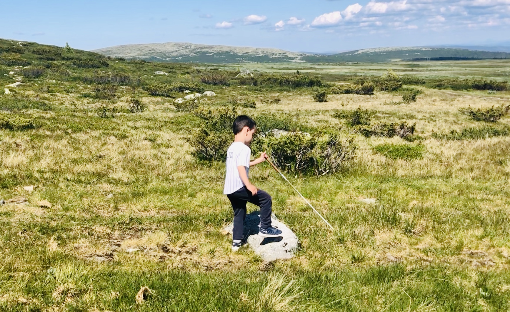 Bilde viser Thomas og Luca som er ute og trener med lange stokker langs en gang- og sykkelsti.