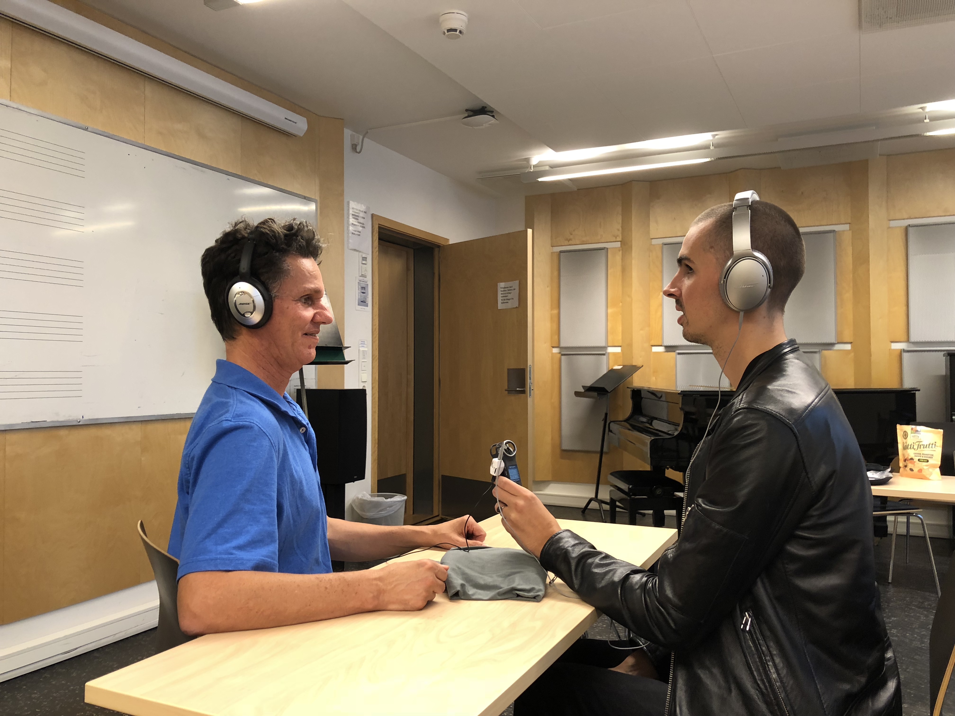Vi har produsert vår egen podcast serie. Bilde viser Daniel og Thomas som spiller inn podcast.