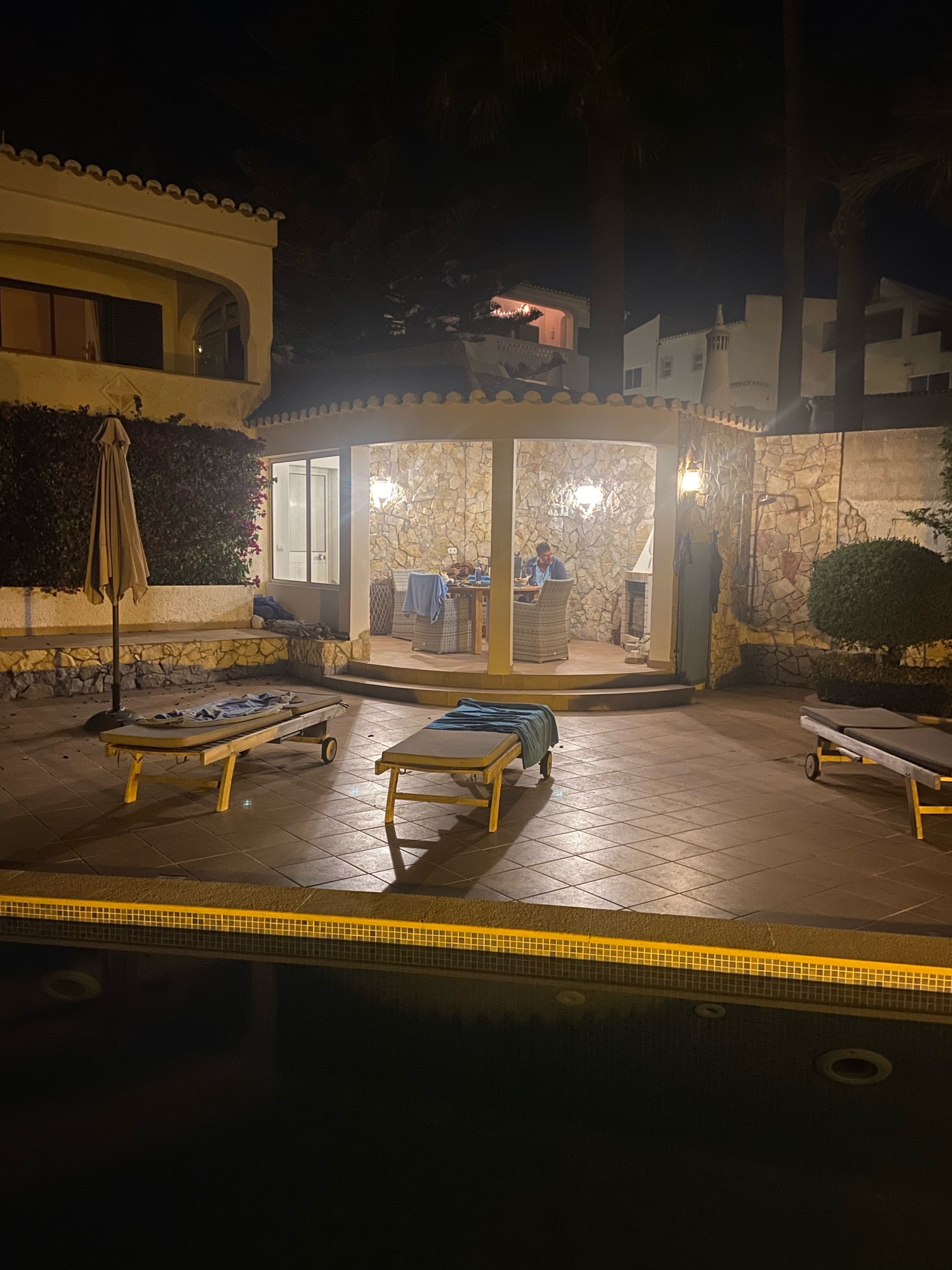 Das Haus hat eine Wohnfläche von 143 m2 und verfügt über zwei Schlafzimmer, zwei Bäder, Küche, Esszimmer und Wohnzimmer mit Kamin. Auf der Poolterrasse befindet sich ein großer Pavillon mit einem weiteren Kamin. Ein großer gemauerter Grill befindet sich direkt bei der Küche.