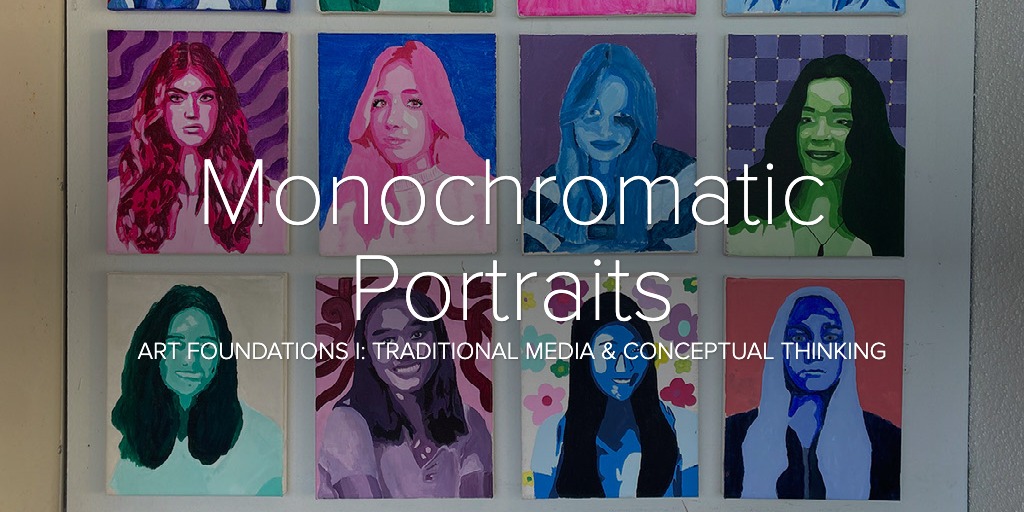 Students in Art Foundations I learned about color theory and the use of value to create dimension within a work of art. Beginning the year with drawing, students were led through all of the fundamentals, ending the quarter with a skill culminating self portrait painting. Through transforming their image in Photoshop utilizing Posterization, each value within their portrait is simplified into an individual shape. After choosing their monochromatic color and applying their knowledge of color theory, students worked over the course of a few weeks to paint and complete their portrait. With freedom to design their background, each portrait holds both realistic and symbolic elements of each student.