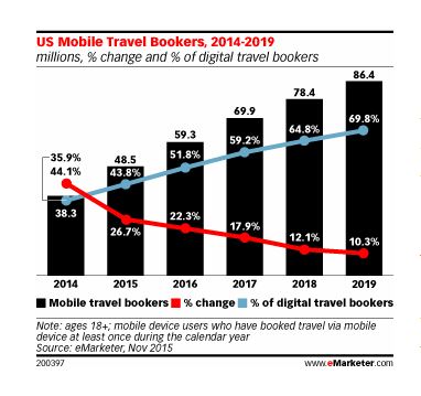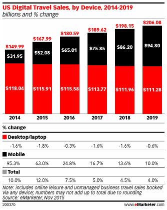 Travel sales via mobile devices is also expected to continue its rapid rate of growth, with mobile spending projected to become 46% of all digital travel sales in the US by 2019.