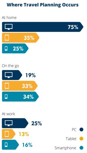 Smartphones are being used not only for planning on the go, but also at home or at work. On the go (mid-trip, running errands), tablets and smartphones are more often the devices of choice for additional travel planning or trip changes.