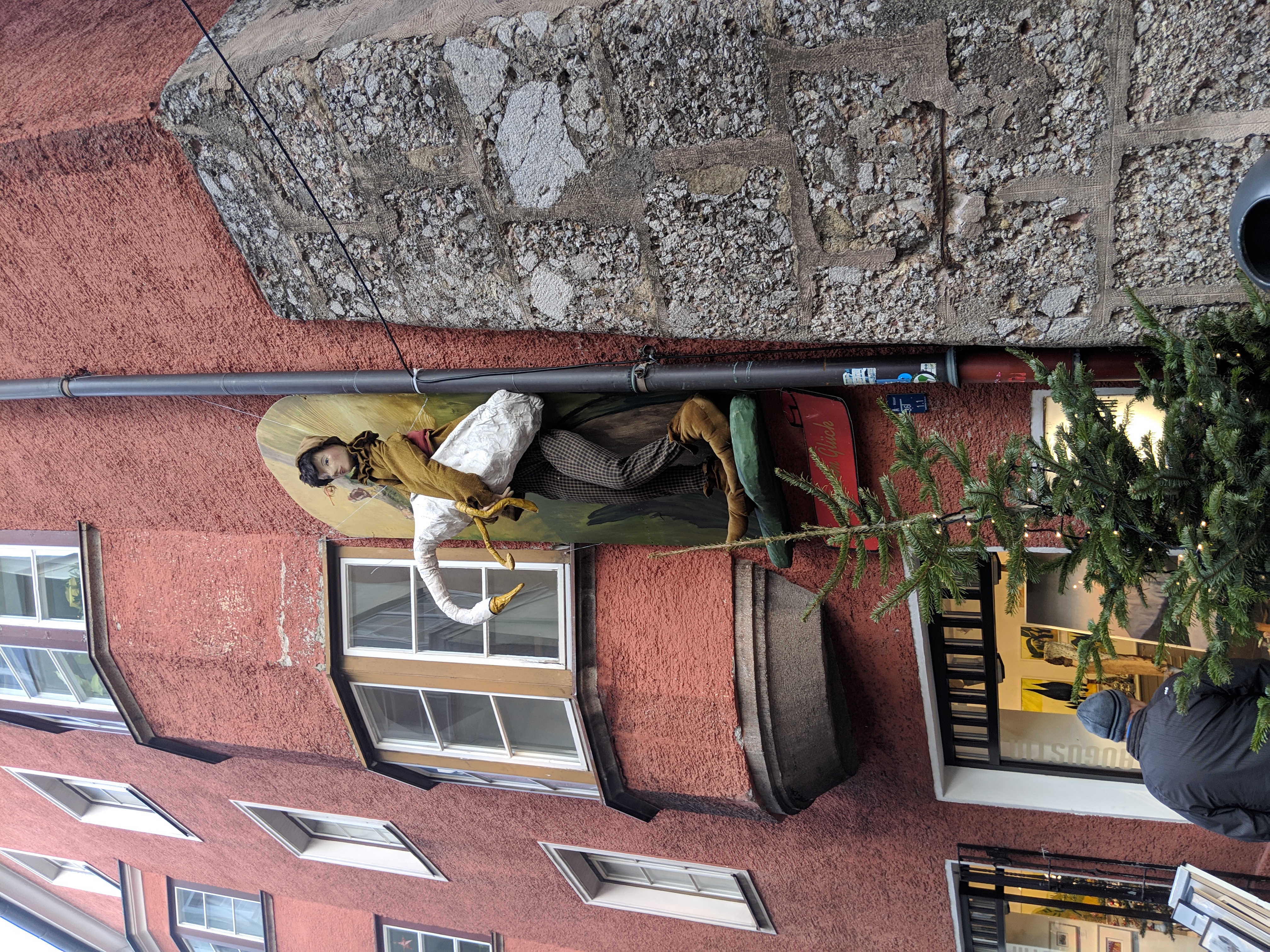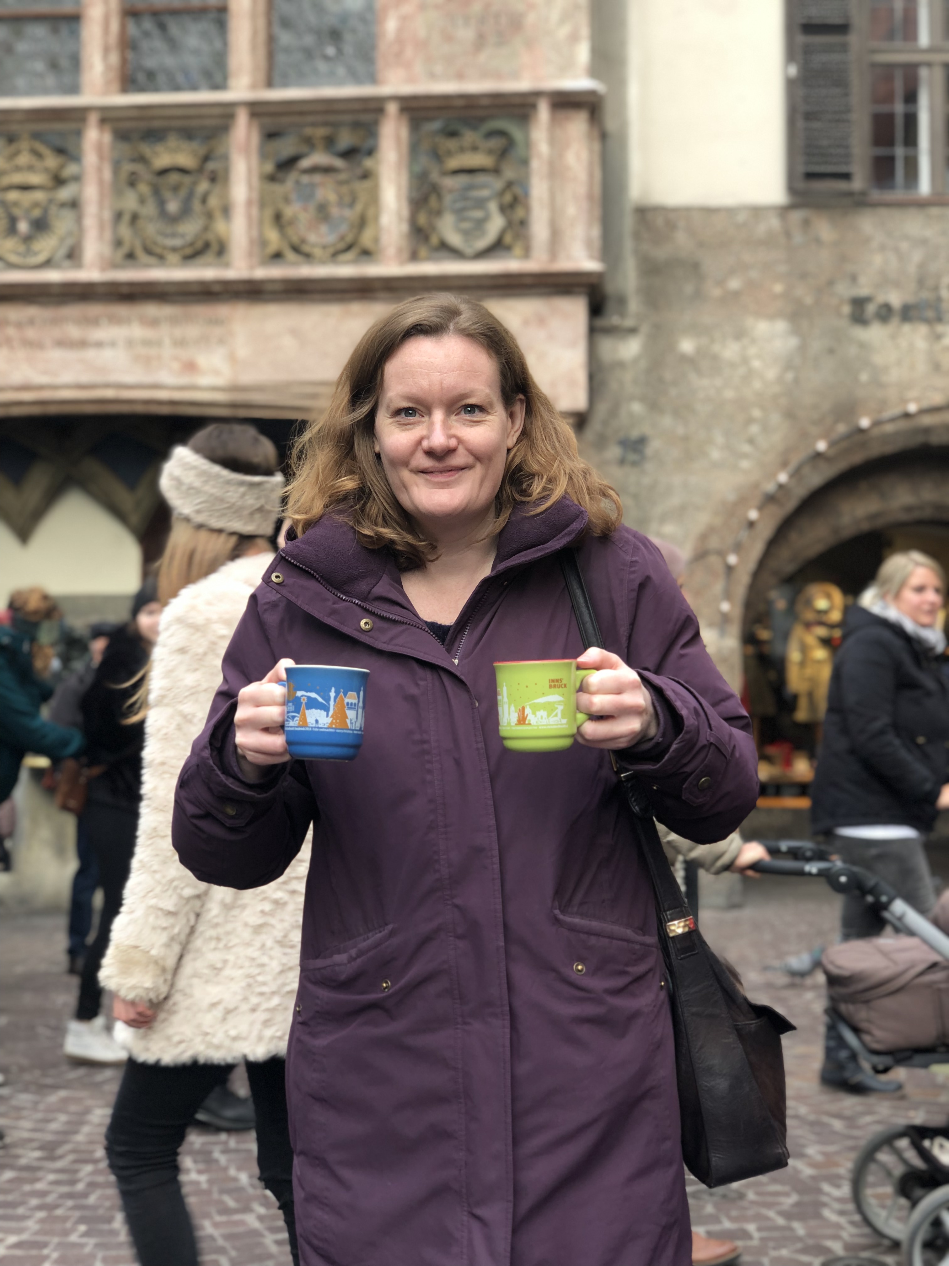 We’re at the Golden Roof, some big historical .. thing.. in central Innsbruck, at the head of a very large pedestrianised area with shitloads of stalls and thousands of people. It’s great. We stumble through the crowds and past the girls dressed as angels because wait what?
