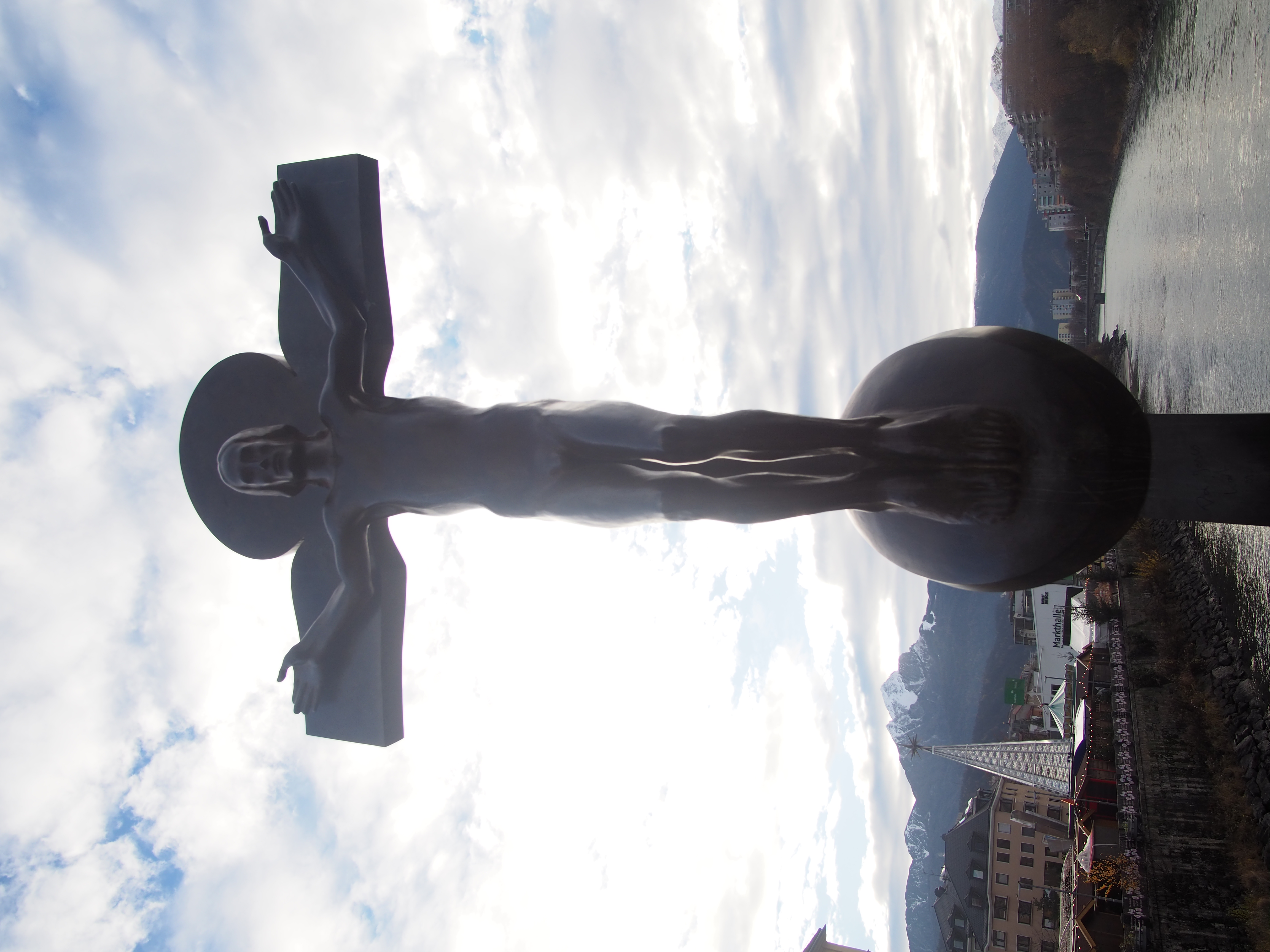 The bridge here goes over the river Inn, which makes it the Inn’s Bruck. Midway along it is a large Jesus. The sun is behind him and I’m a bit drunk and not a good photographer. So, you can have moody silhouette or detail surrounded by horrifyingly over-exposed sky. Take yer pick.