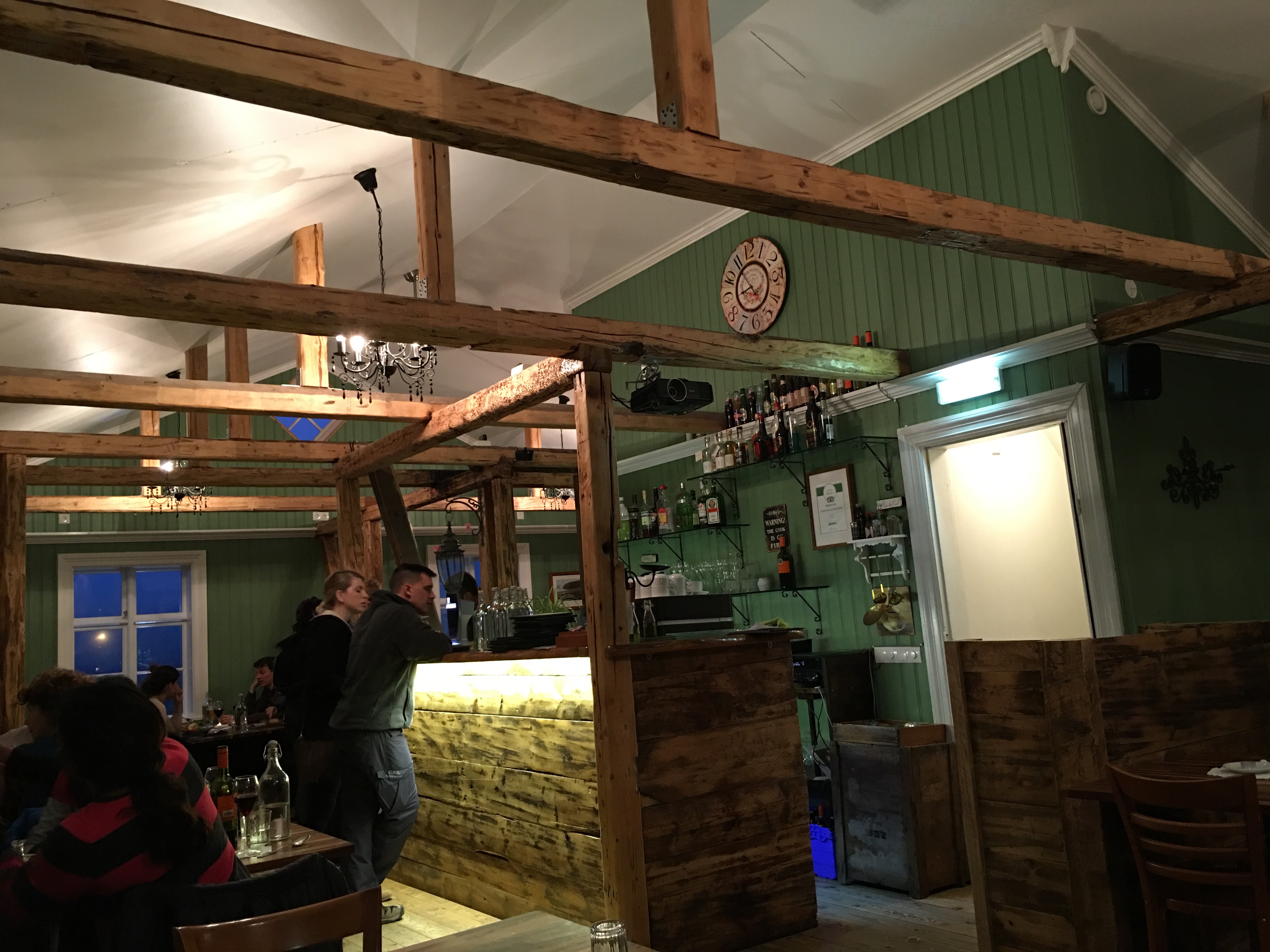 We had a nice dinner and Einar and Ragnar gave us a lot of great info and tips on possibly getting a good shot of the Northern Lights a.k.a. Aurora Borealis. The problem was that at around 10PM when we finished dinner the lights were no where to be seen. According to their calculations we wouldn't have a clear shot of seeing them til around 3-4 AM. There was no way I could stay awake that long so I told Scott that we should just crash now and set an alarm to wake up and go outside.