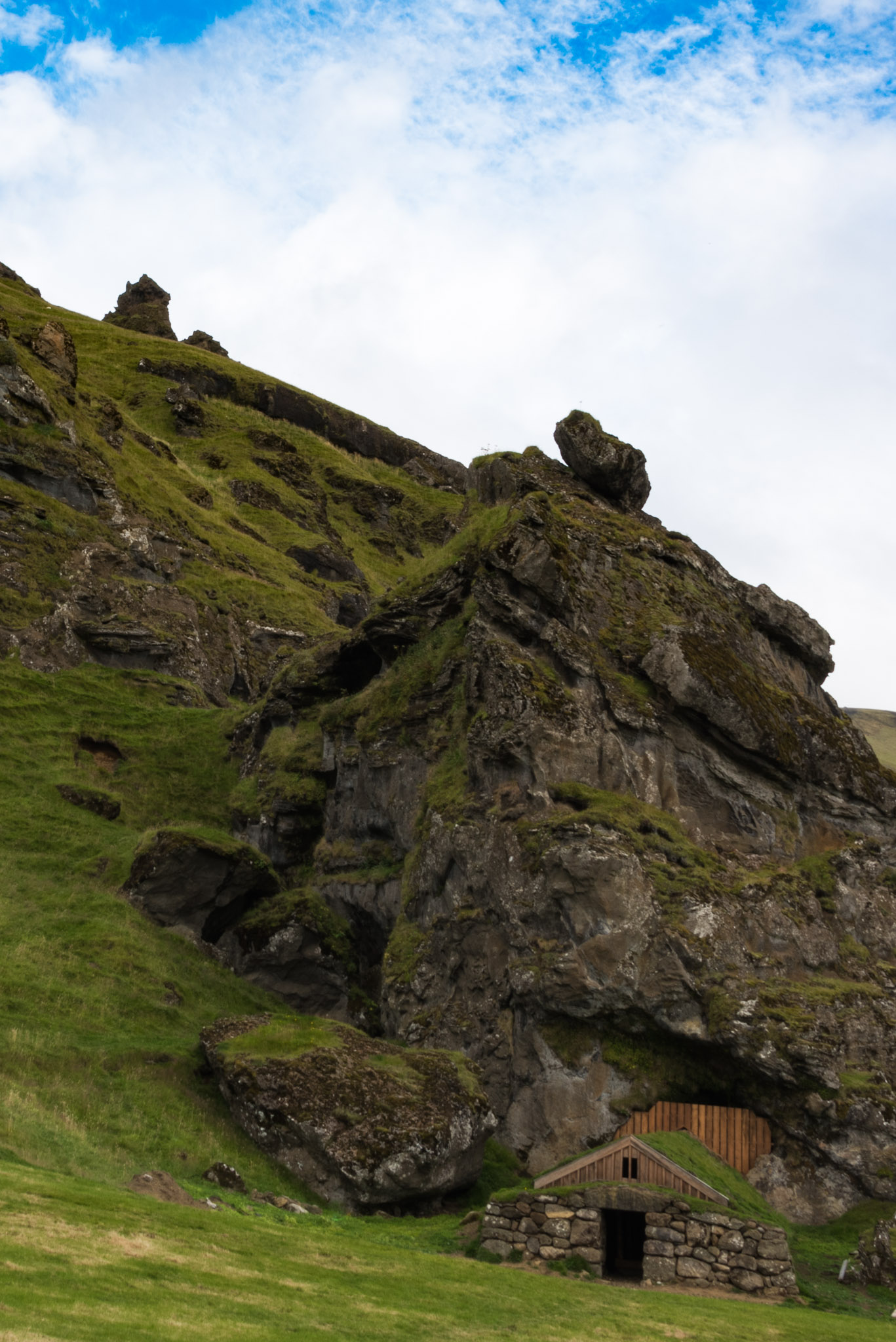 This is a refurbished sheep house. They used a cave inside the cliff with safe building material and to keep the hay for the sheep inside. It had nearly fallen apart a couple of years ago, but is now being rebuilt. By the way, using an old traditional method that should make it last. If I am right they used flat thin stones, like stone shells between wooden supports and then put the turf on top of the stone shells. This keeps the wooden support from rotting by the turf, as it stays dry, sheltered by the stone shells. The walls are made of stones and specially cut and laid down turf.