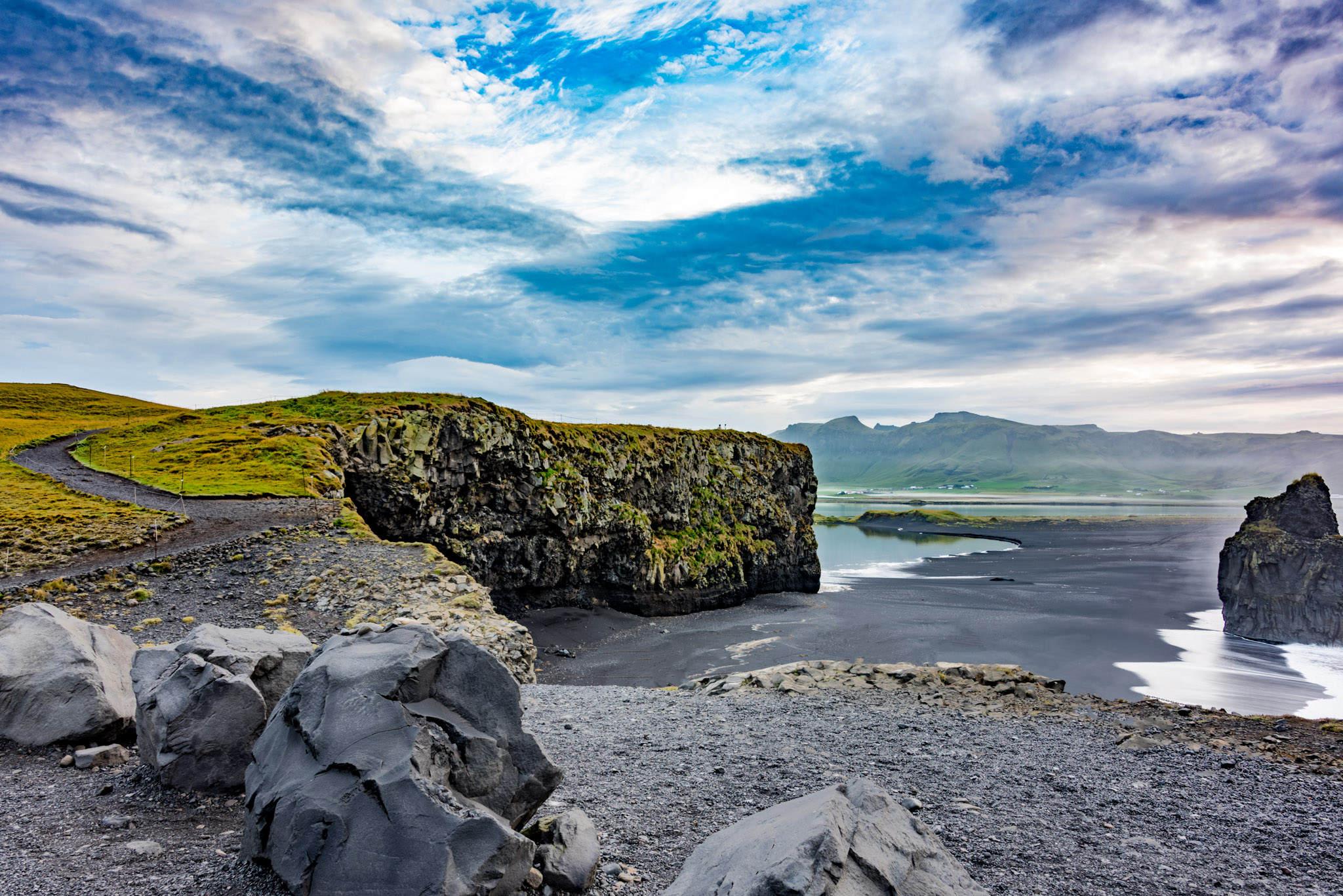 Although the drive to Vik is only supposed to take about 3-4 hours, I guarantee that it will take longer. There are many many opportunities along the way to stop, get out and start shooting. This was the 1st waterfall we wanted to shoot in route. Here in the US a waterfall like this would be a major tourist attraction, but in Iceland waterfalls are literally EVERYWHERE. By the middle of our trip we would pass a waterfall and say very sacarstically "look another waterfall, should we stop?" Then we'd laugh and keep driving. Here at Seljalandsfoss there were four waterfalls in a row. When you pull into the parking lot there's usually a tour bus or two and people scattered about shooting each one. Sigh, people a.k.a. "tourists". With all the people it's practically impossible to get a shot without people in it. Chances are if you want your shot without people you'd either have to get there very early in the morning (not a bad idea) or be prepared to Photoshop them out. This particular waterfall also has access behind it which makes for a very dramatic sunset shot. However, the weather wasn't cooperating for us to shoot it at sunset.