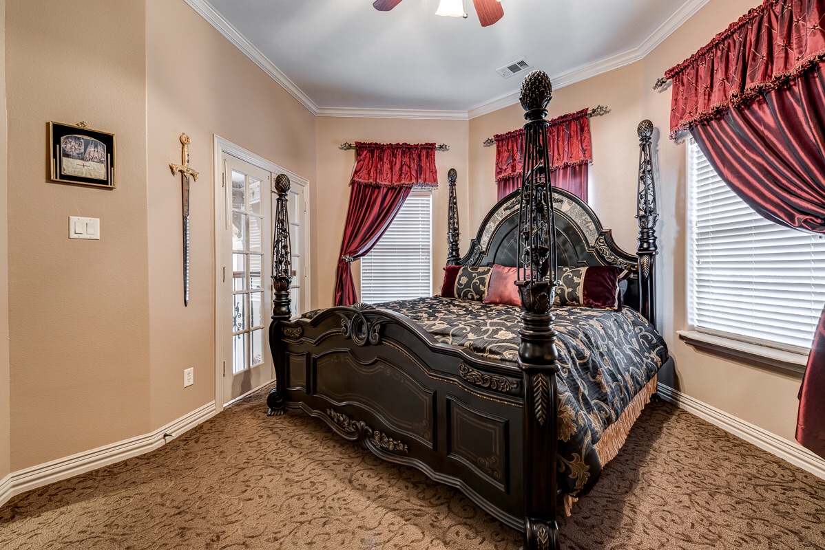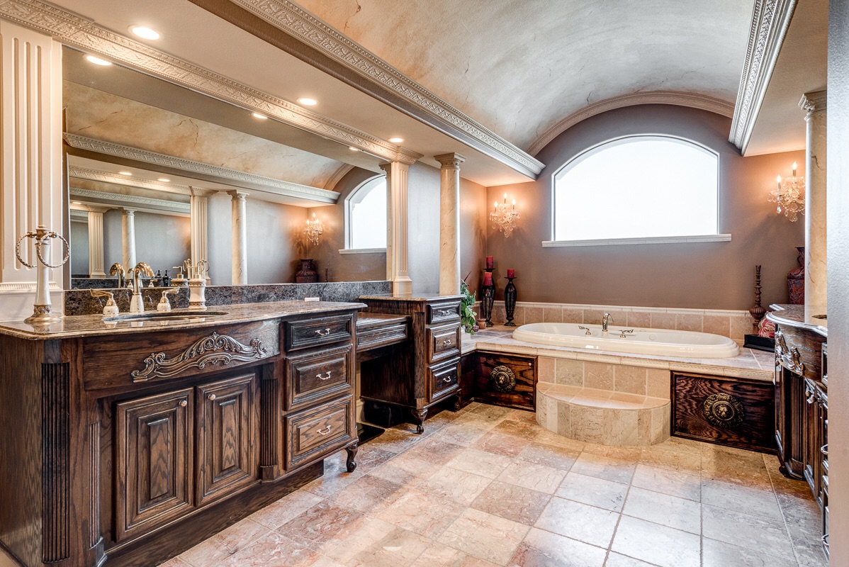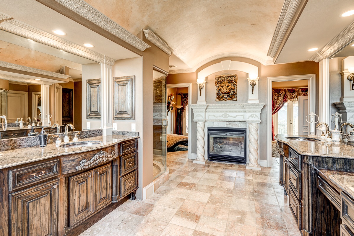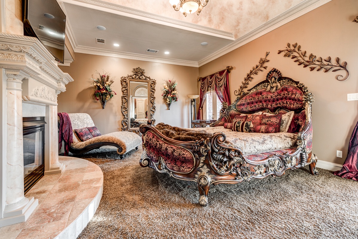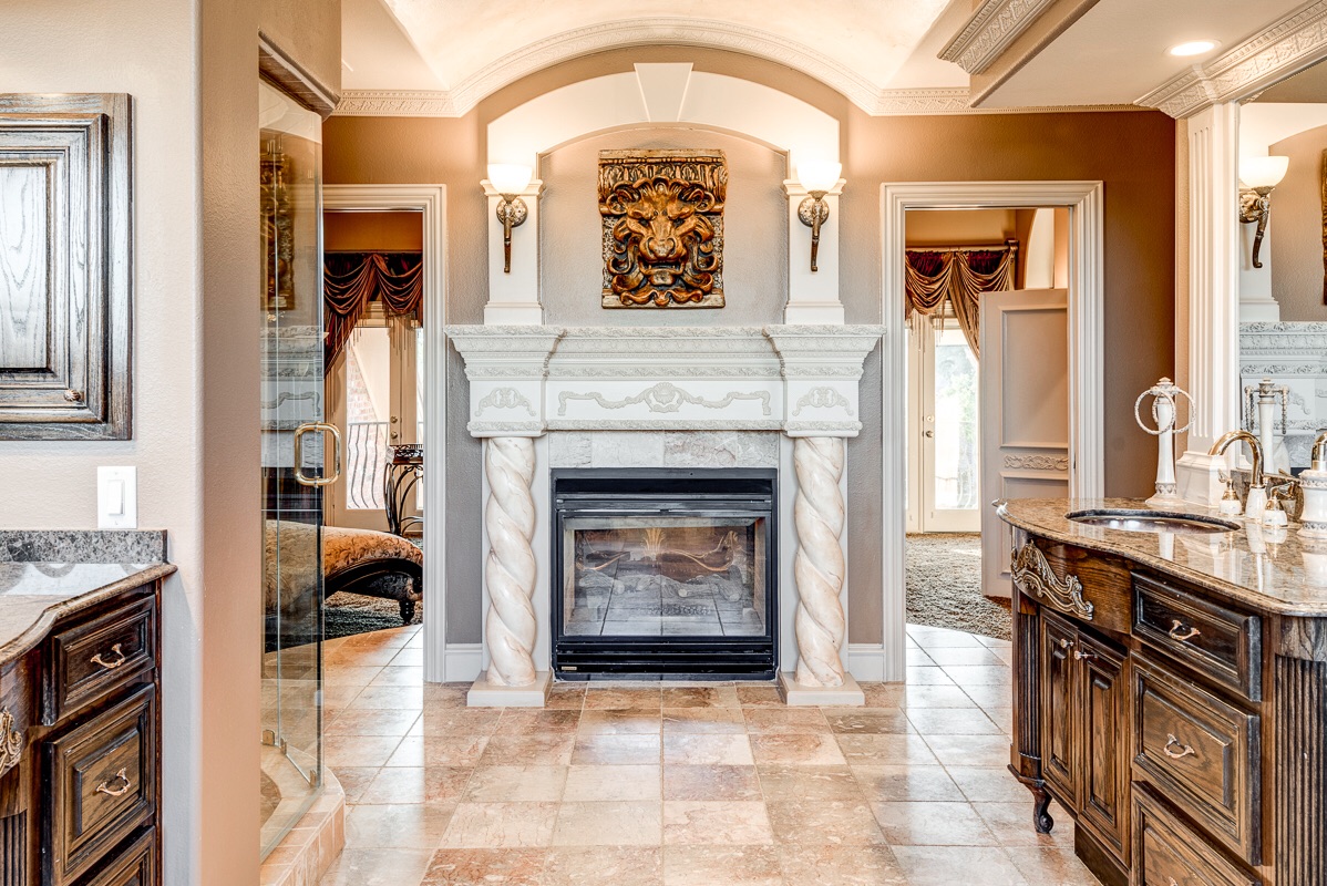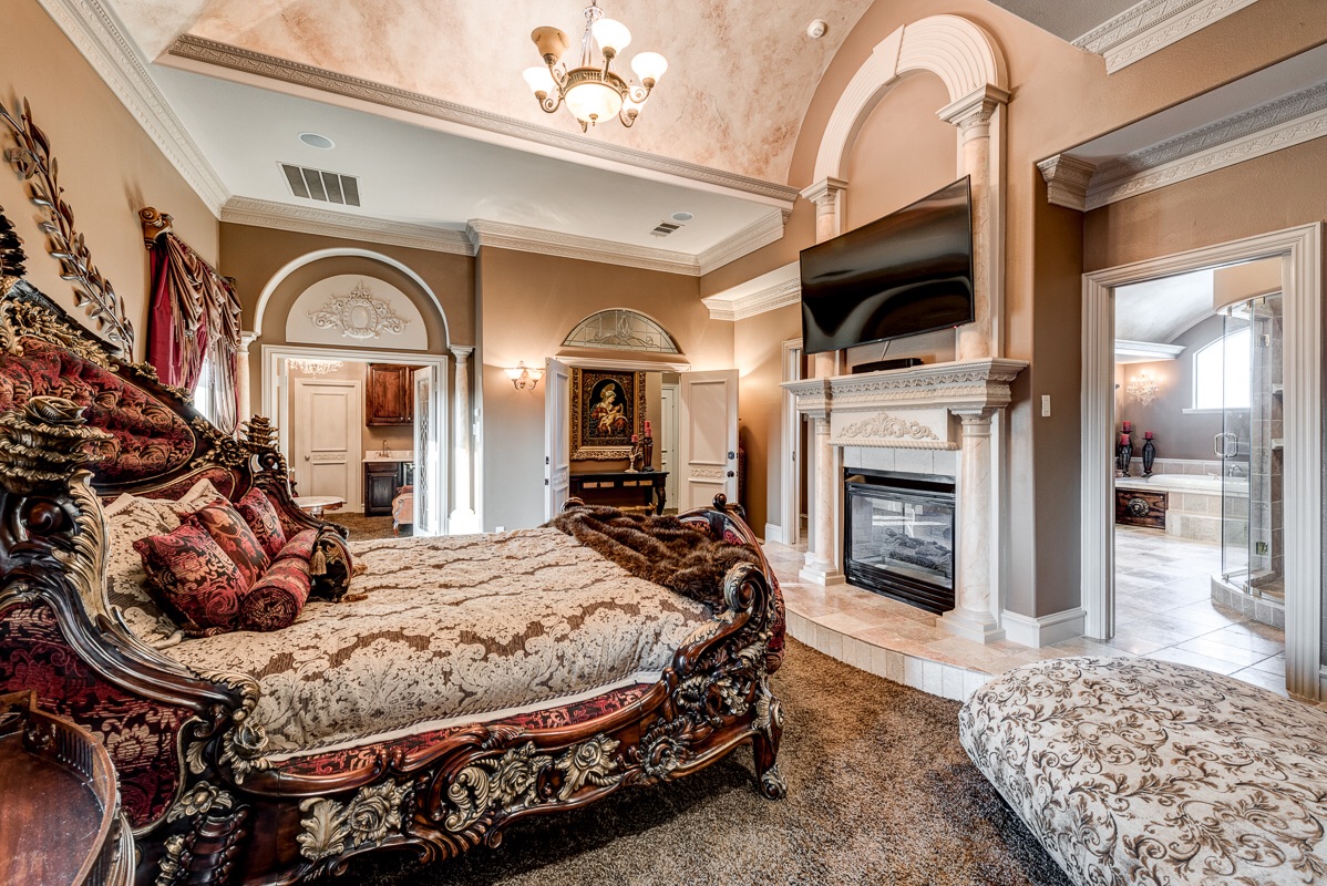 The third floor Master Bedroom has your choice of elevator access or a private staircase that opens up to a double door penthouse entrance arched with sculpted glass and columns that enter into the master bedroom suite. This extra large master suite includes an additional large bonus suite room with chandelier and coffee bar, double sculpted glass privacy doors, two walk-in closets, a cedar closet, and a double sided see-thru fireplace into the Master Bathroom with two sliding pocket entry doors.