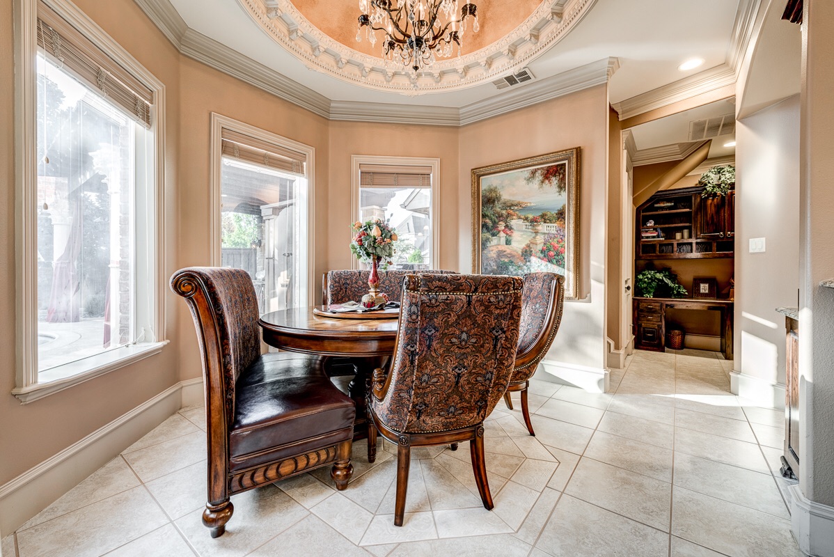 The two dining area options access the kitchen with ease. The turret-shaped dining area, big enough for a very large table, features three large, solar tinted windows for energy efficiency and privacy that view all of the backyard areas, pool and hot tub. A 16 foot long, 36 inch high bar faces the kitchen for quick serving capabilities.