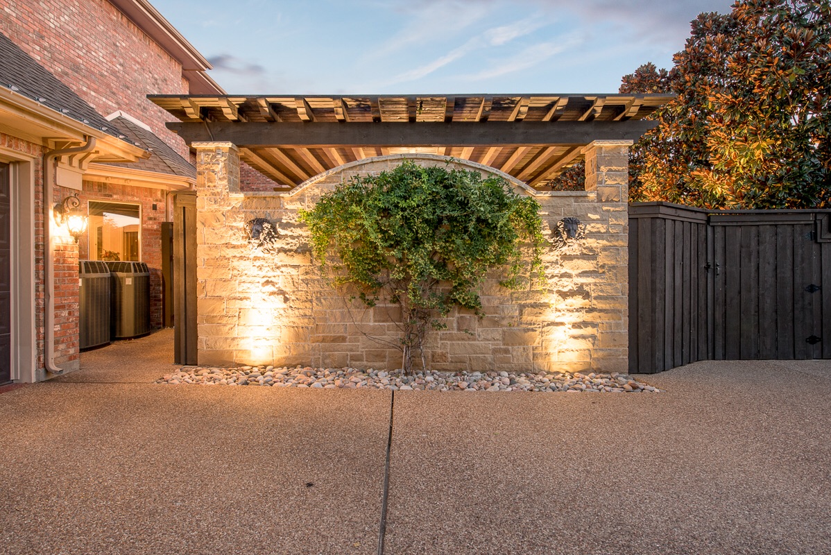 A dusk view of the landscape lighting on the back of the stone wall of the Outdoor Kitchen and Pergola.