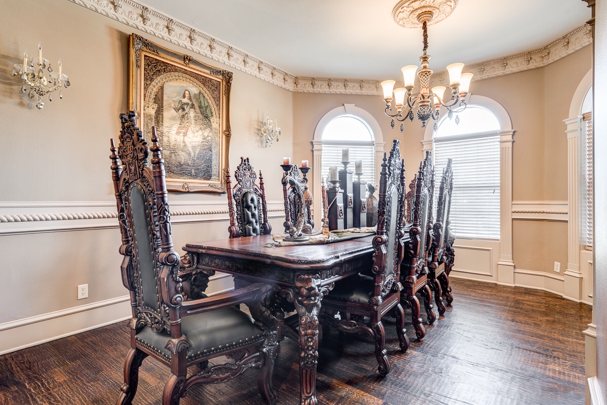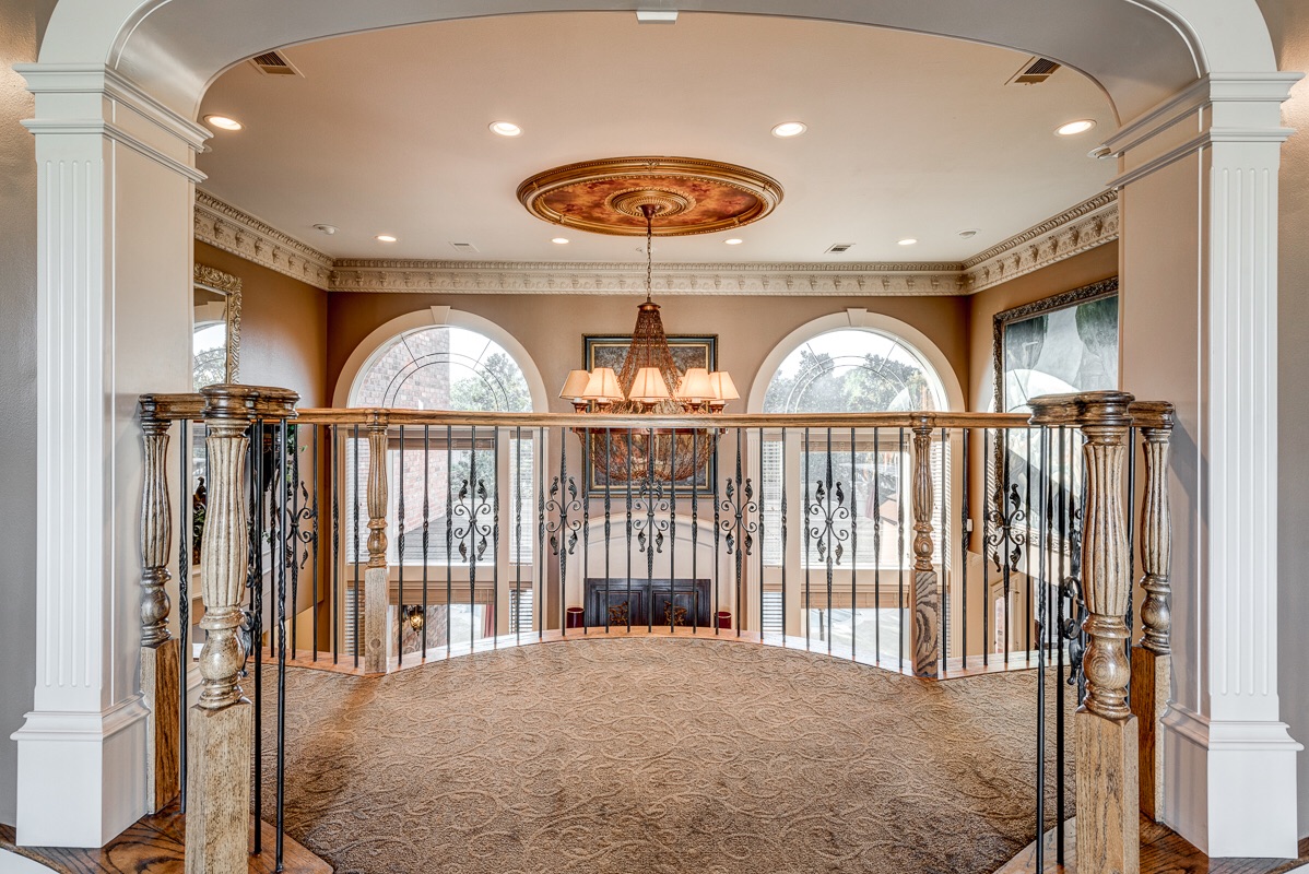 This home was specifically built for entertaining family and guests of all ages. Sitting off of the foyer is a one of two grand arched entrances. This one is to the Music Room (formal living area). You will also notice the iron on the staircase and on one of the two Romeo and Juliet balconies that overlook the foyer.