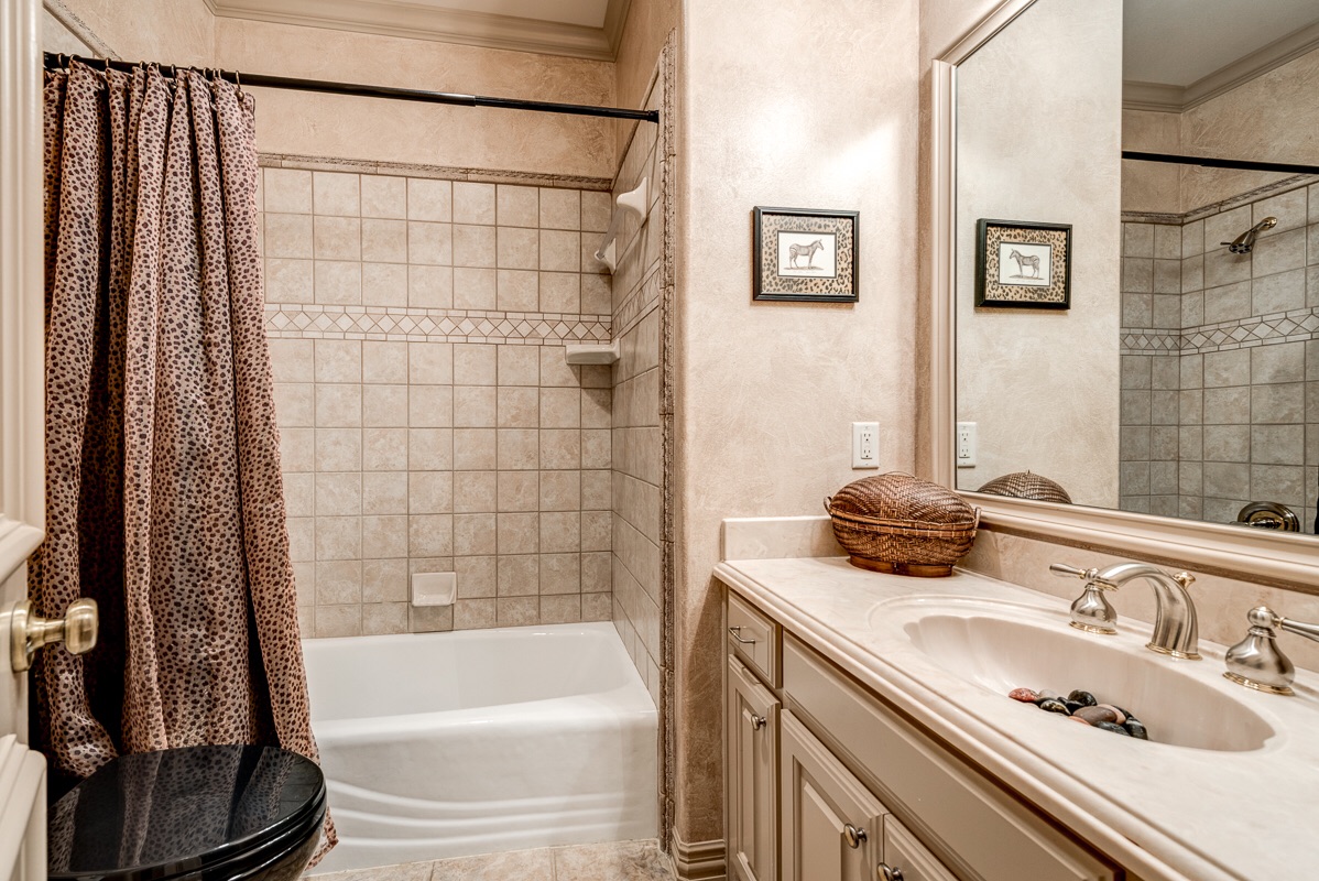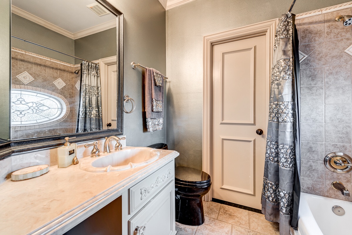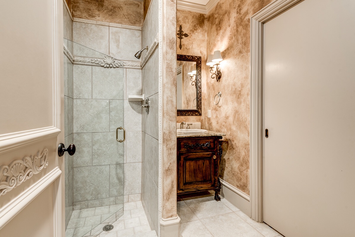 The first floor guest bathroom that is also connected to the first floor bedroom features a large walk-in shower and provides bathroom access to the main Living Room and Study/Library.