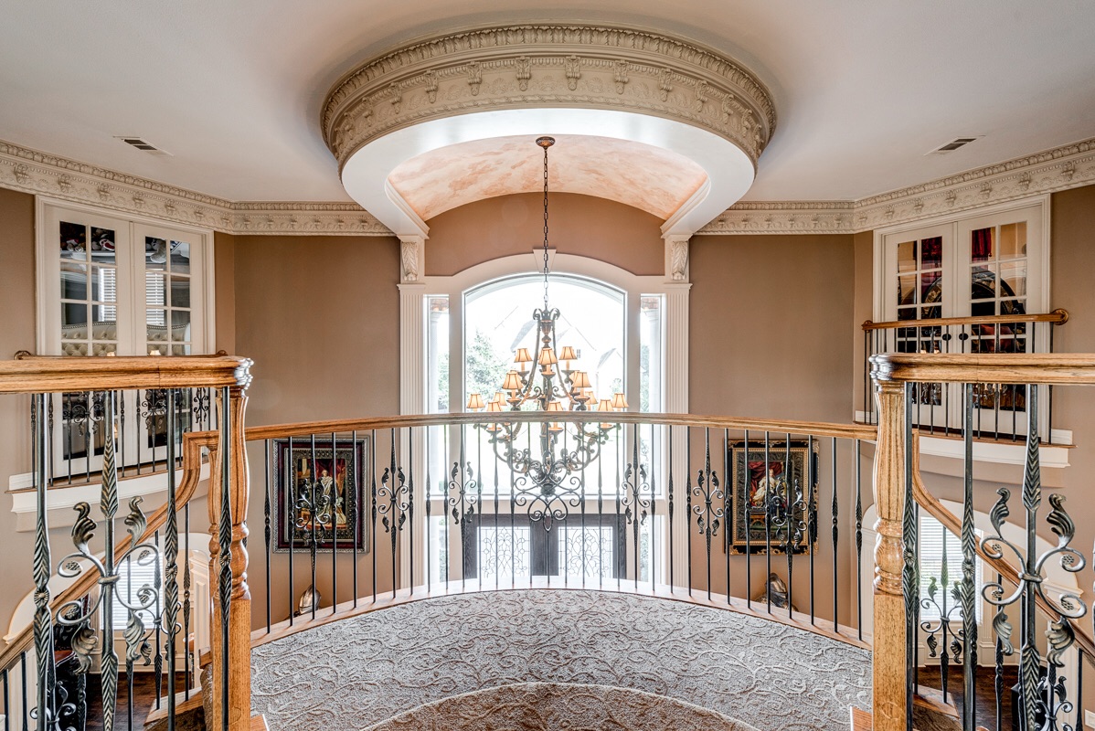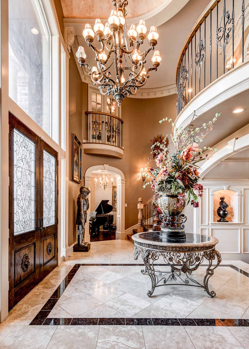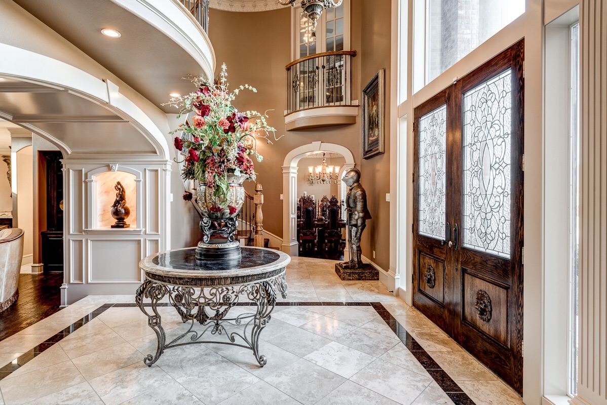 Upon entering into a grand column and arched double doorway, you will find a jaw-dropping entrance into a travertine and marble lined foyer with dual staircases that view opposing 2nd floor Romeo and Juliet balconies that overlook the foyer from two of the home’s 5 bedrooms.