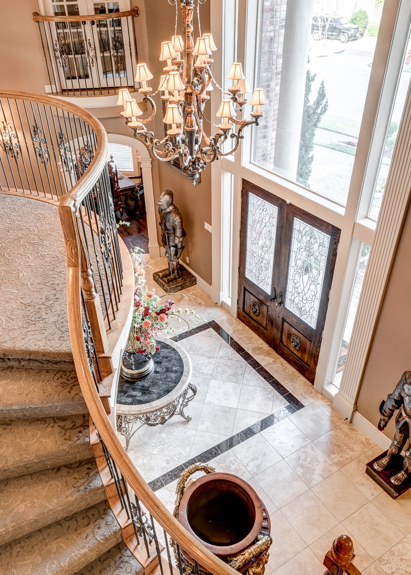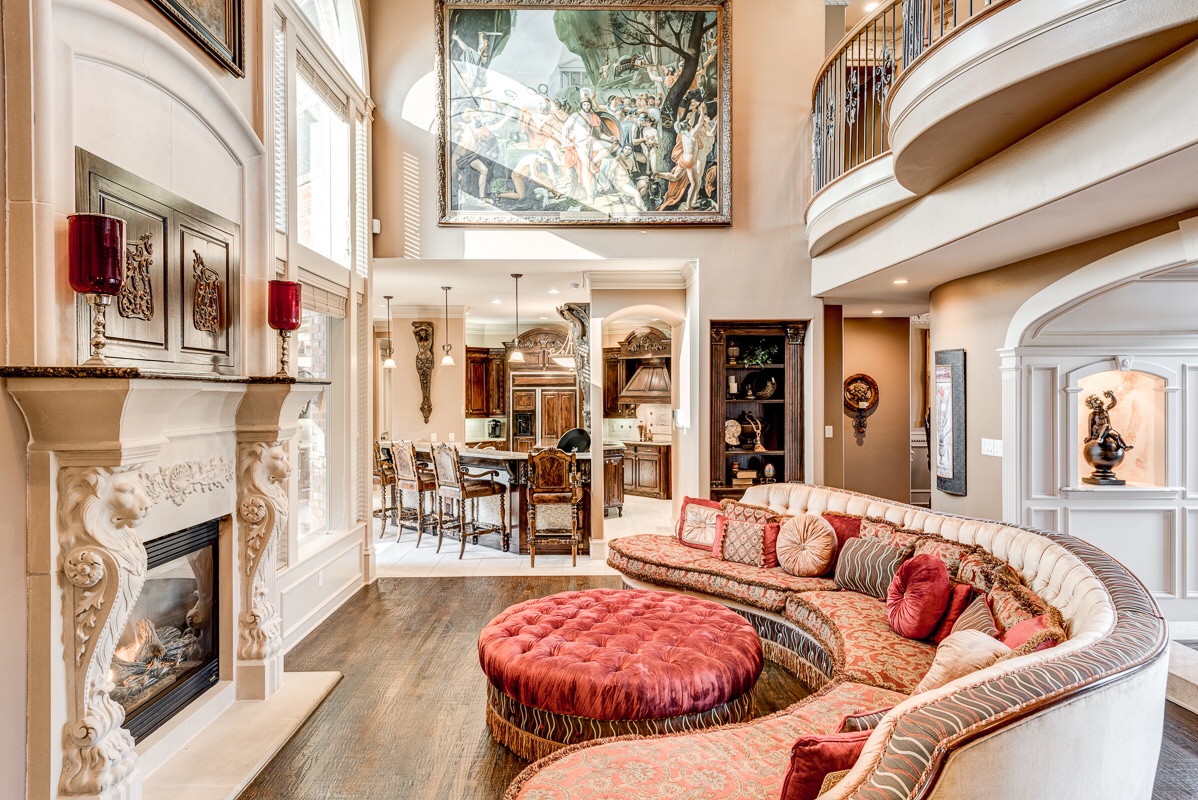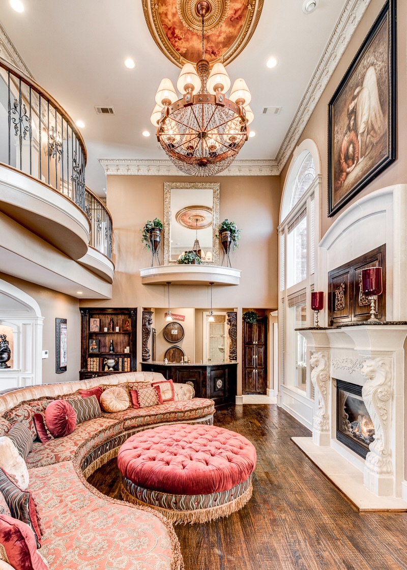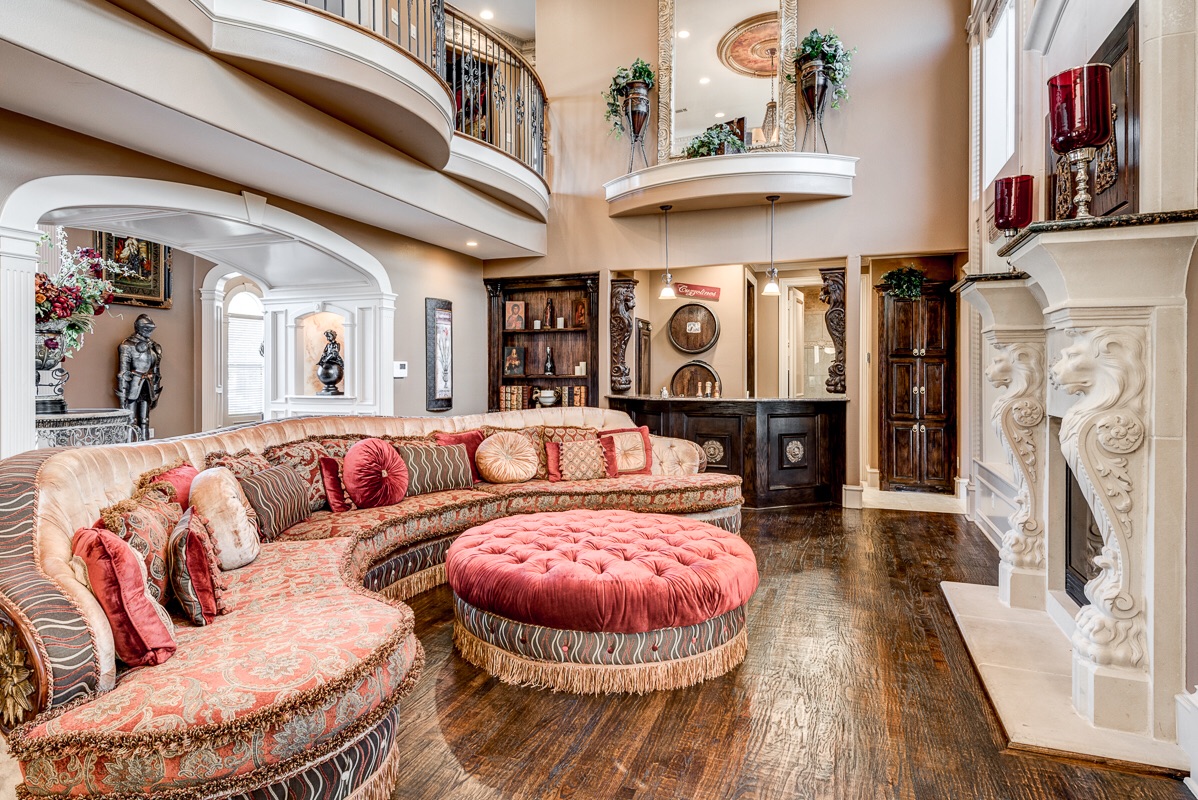 Upon entering into a grand column and arched double doorway, you will find a jaw-dropping entrance into a travertine and marble lined foyer with dual staircases that view opposing 2nd floor Romeo and Juliet balconies that overlook the foyer from two of the home’s 5 bedrooms.
