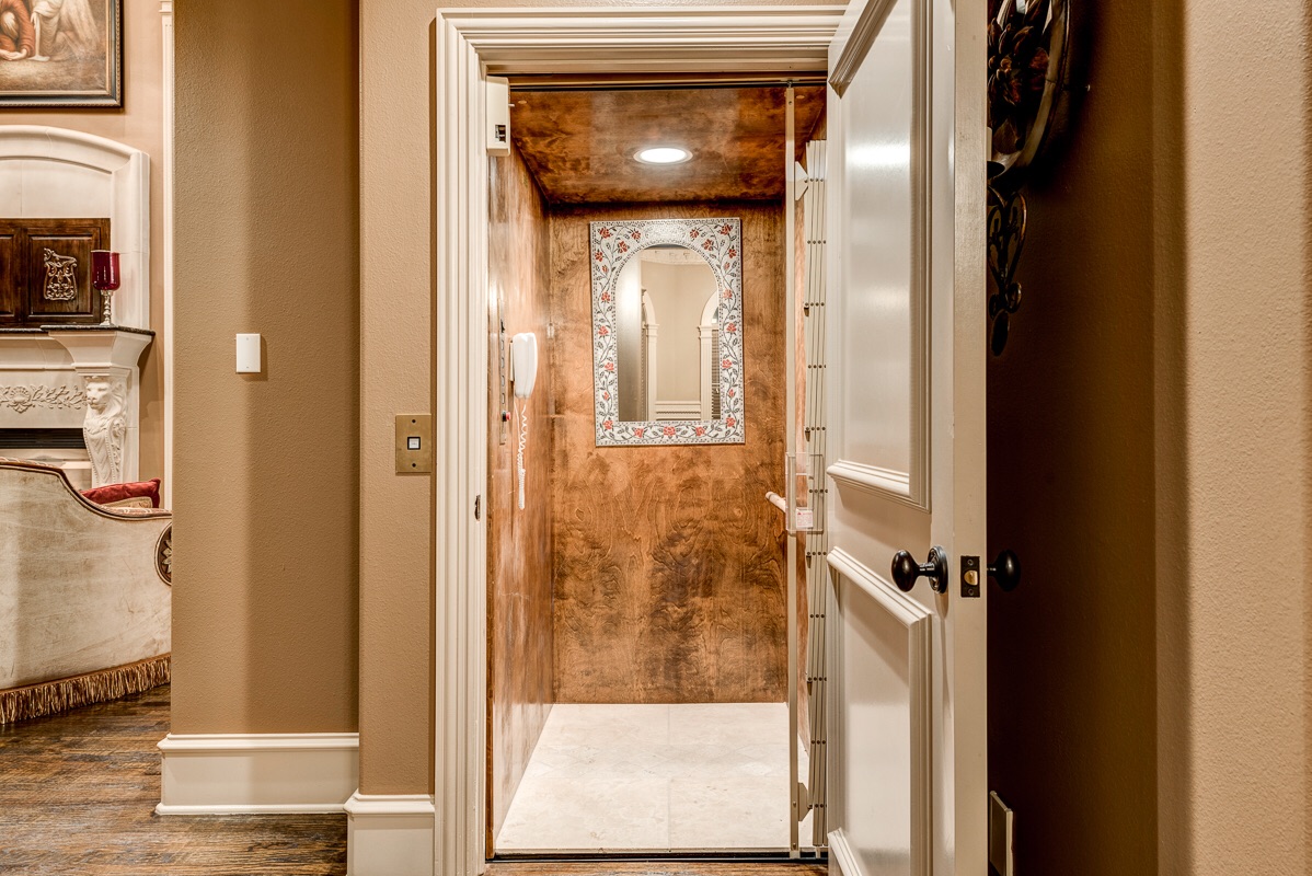 A full-size elevator lined with decorative wood and ceramic tile provides access to all three floors.
