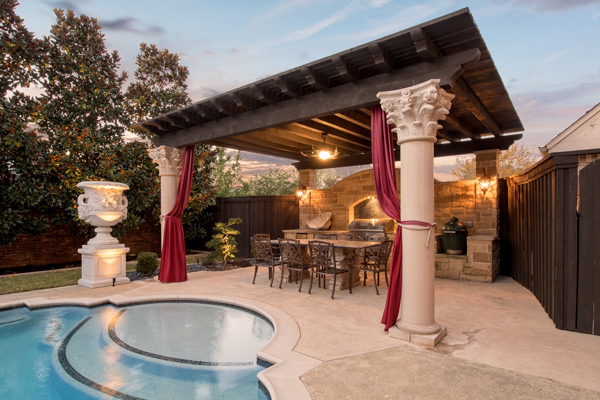 Another dusk view of the Outdoor kitchen. Sunbrella curtains swag each cast stone column for additional privacy and feng shui.