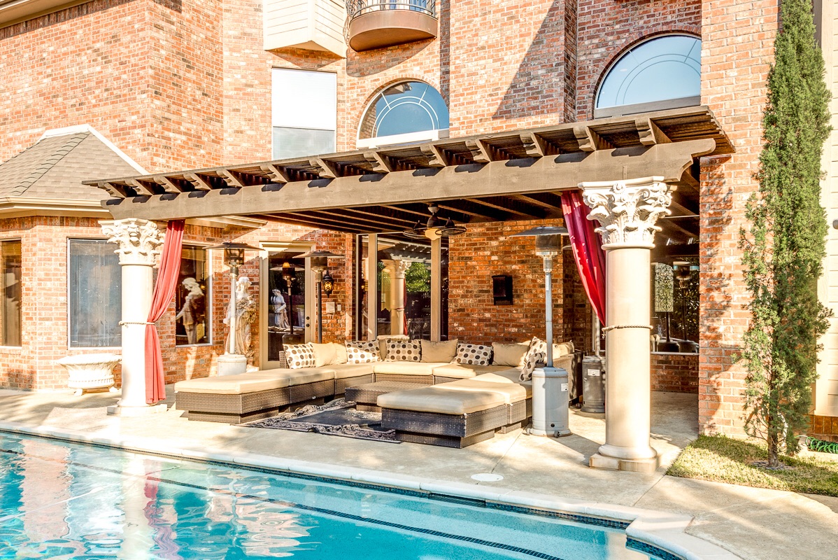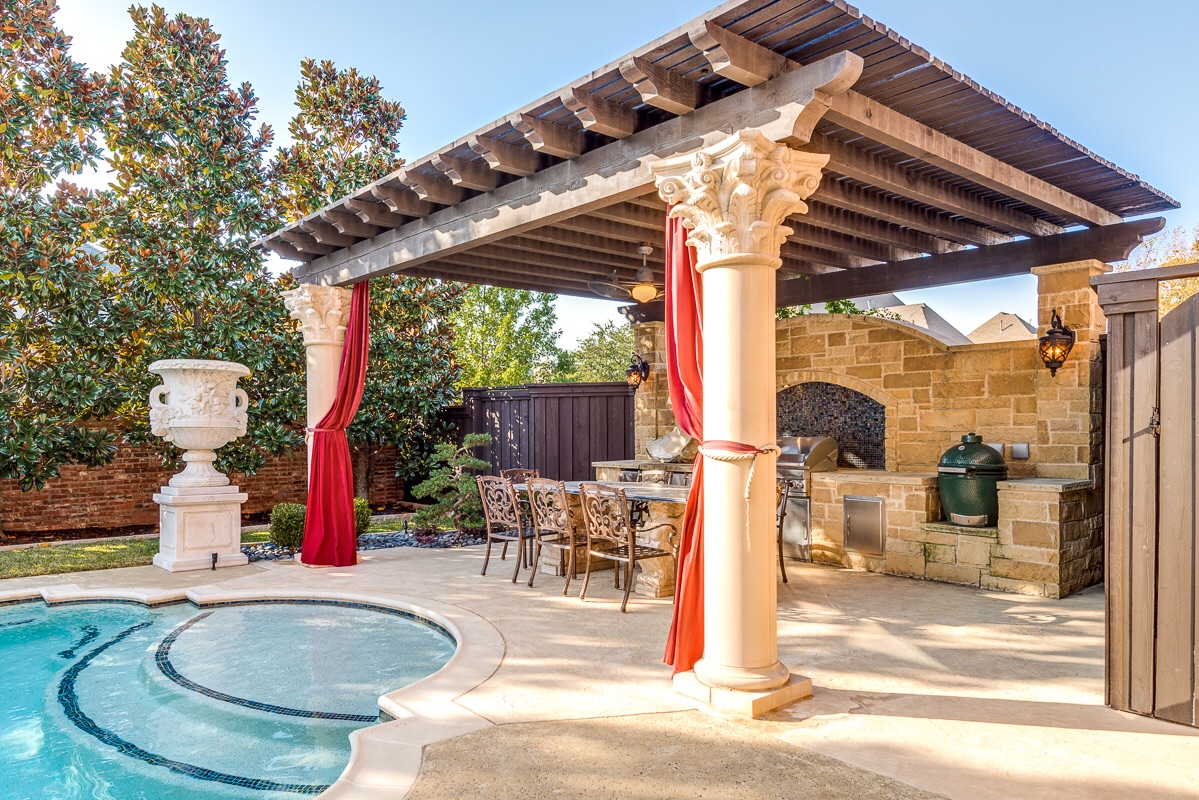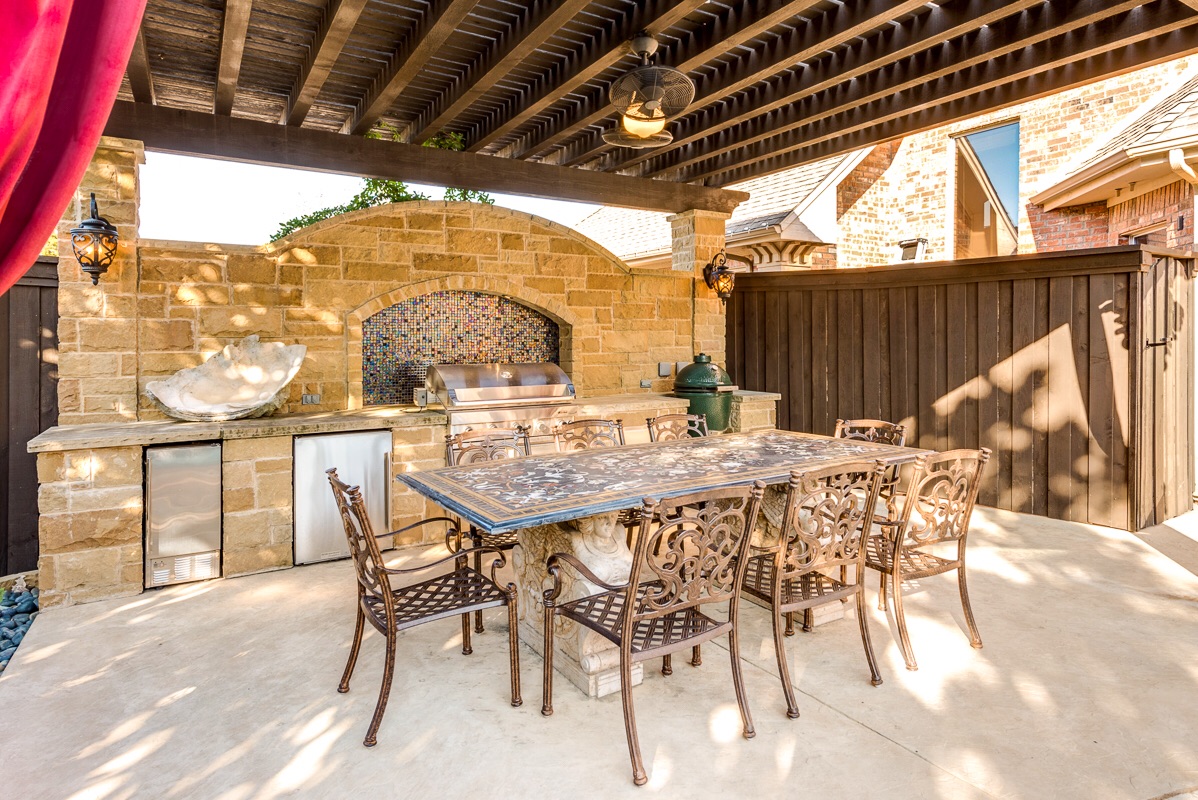 The backyard also incorporates a custom stone outdoor kitchen with its own separate pergola supported by two cast stone Corinthian capped columns. Both of the pergolas have electric outlets for hanging decorative lighting strands and a lighted double ceiling fan.