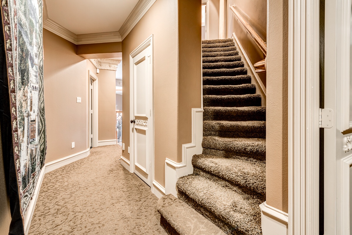 The second floor has elevator access, a linen closet, and a half bathroom with a built-in laundry shoot to the laundry room on the first floor. This bathroom provides for access from the Game Room and two built-in desks with custom cabinet storage areas above the two desks located directly across from the Game Room (not shown). The second level also provides a back stairway access to the third floor (shown). The Master Bedroom is located off of this staircase on the third level.