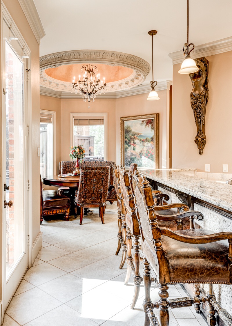 The kitchen dining area also features decorative crown molding, base boards, a chandelier inside of a back-lit painted dome, and a ceramic tile mosaic.