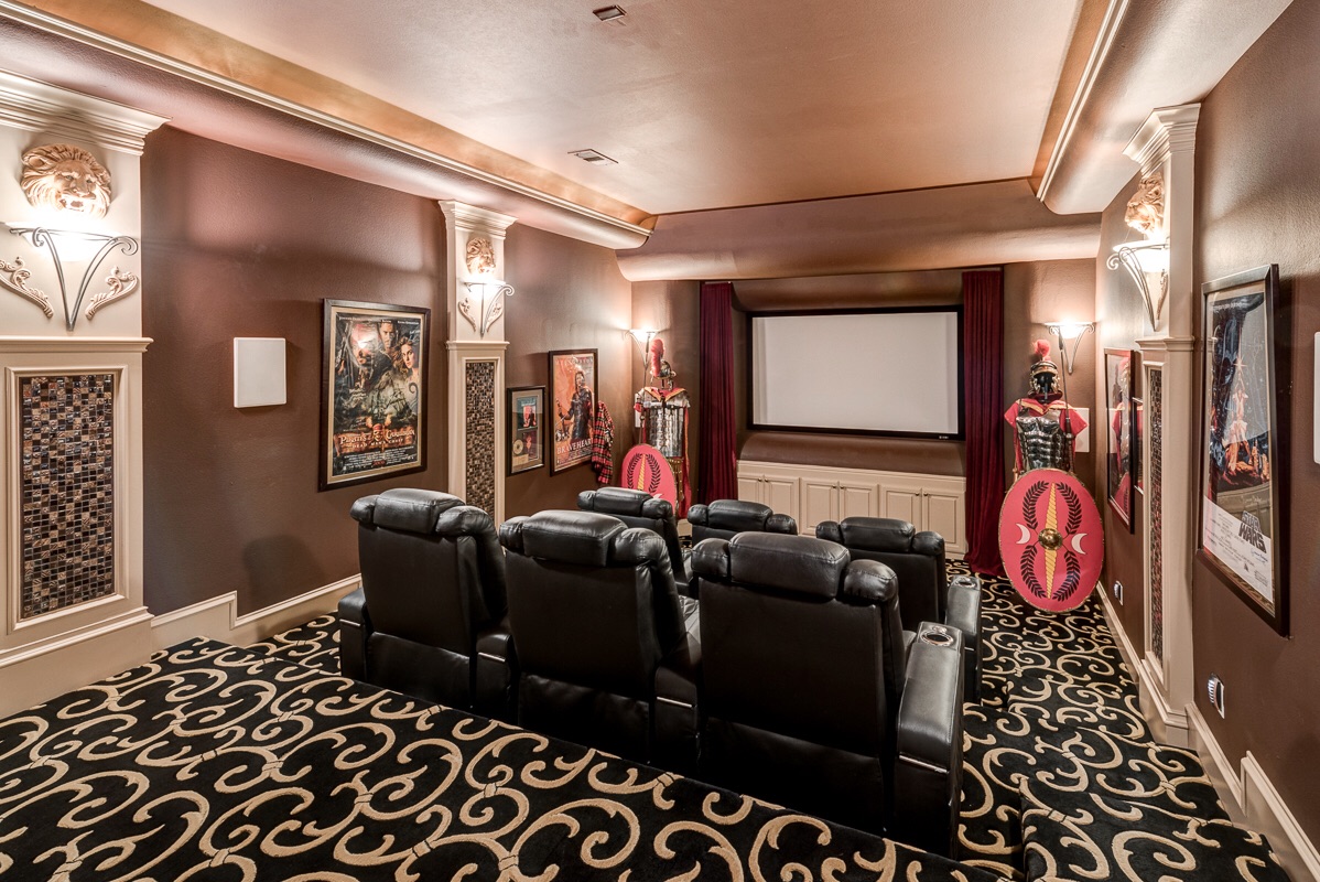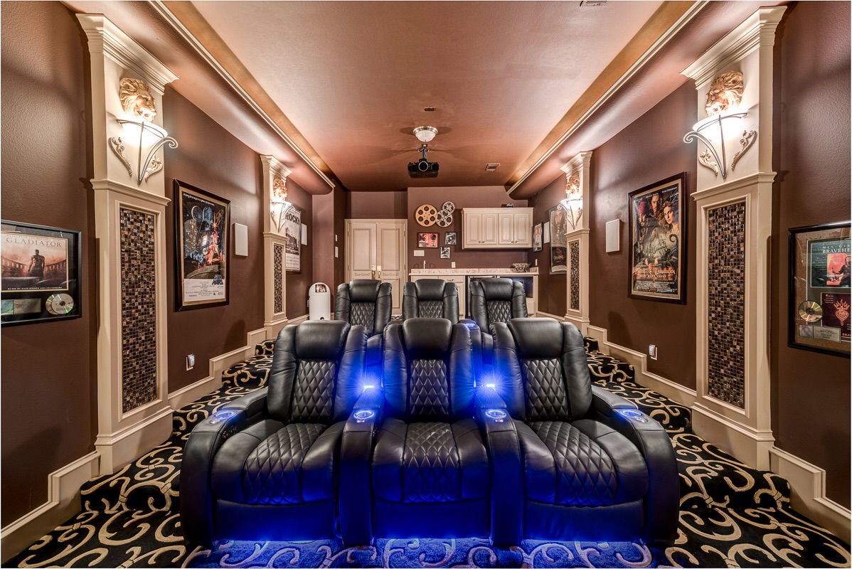 The Theater Room has adjustable lighting dimmers, back-lit barell ceiling, double entry privacy doors, four decorative lighted columns, and six built-in surround sound speakers.