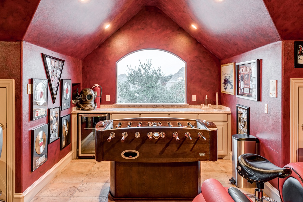 The Game Room is located on the second floor and features four storage closets and a wet bar with undermount cabinets for storage.