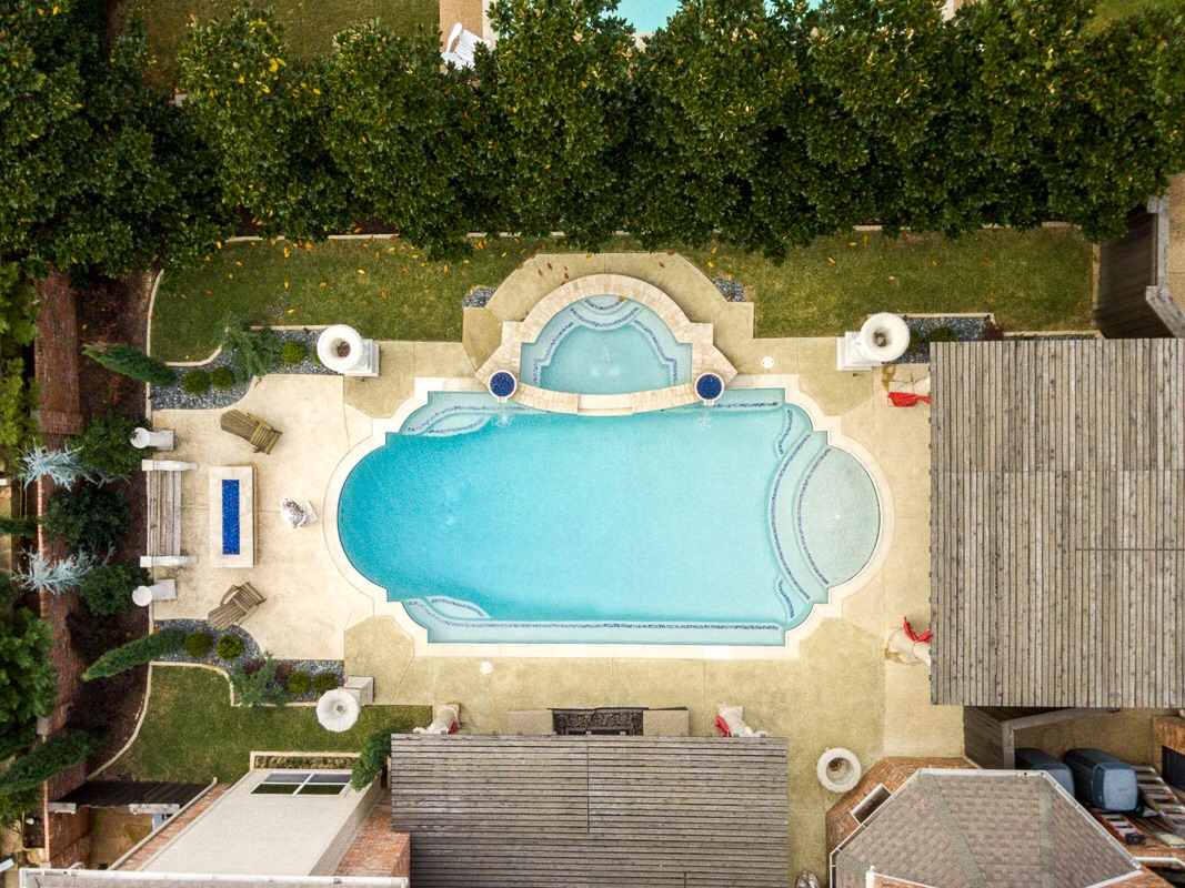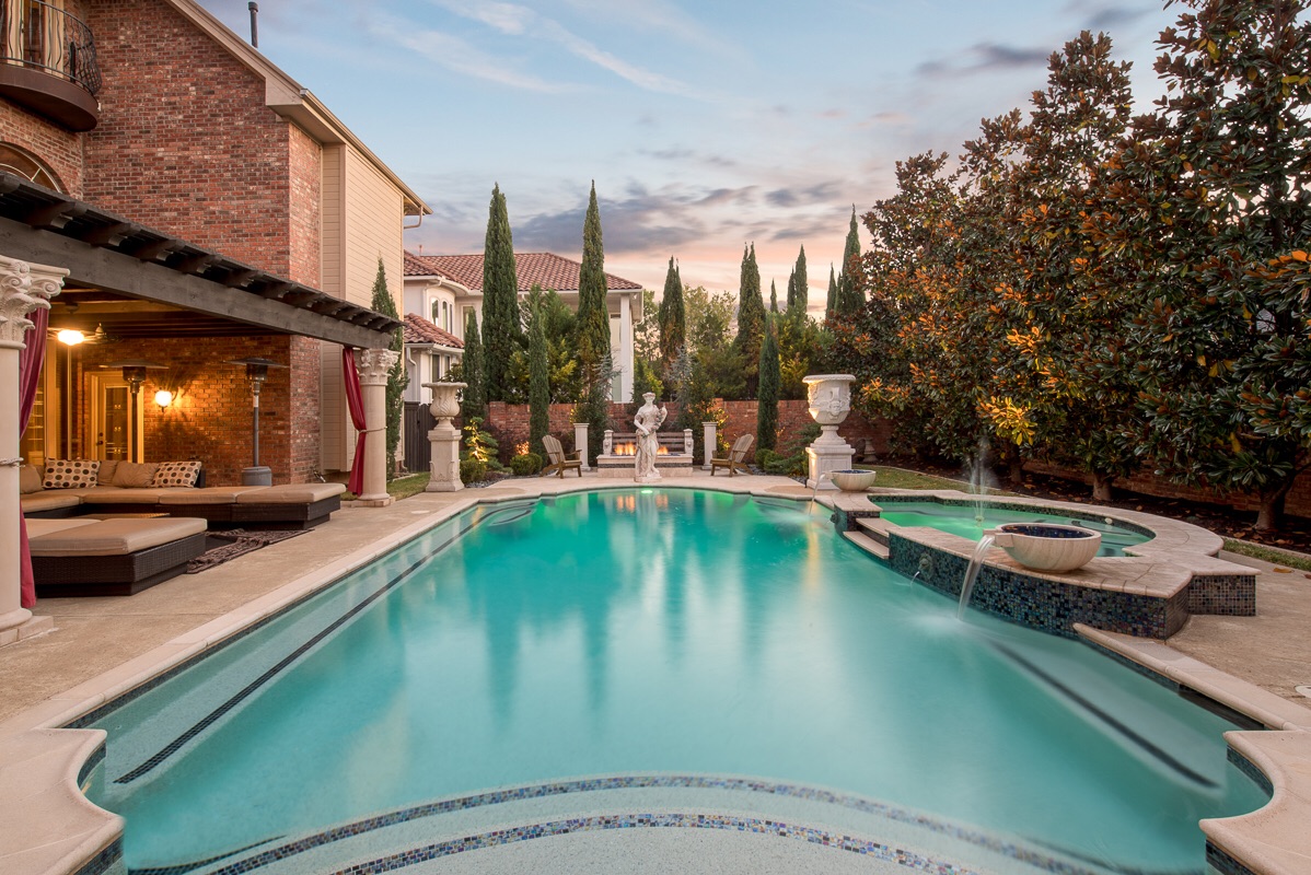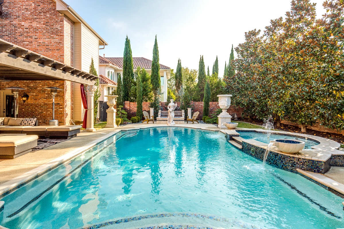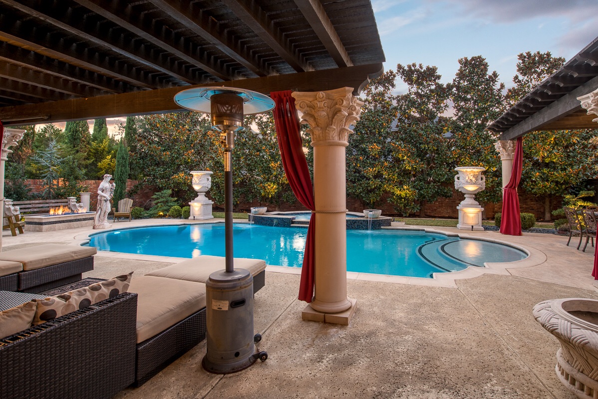 The Backyard features a large heated salt water Grecian 10-foot deep diving pool with attached 12 person hot-tub, 4 cascading water features, 1 fountain feature, and a digital remote control so that you can adjust the water temperature, water features, and customize changing color LED lights in both the pool and hot tub for an evening light and color show.