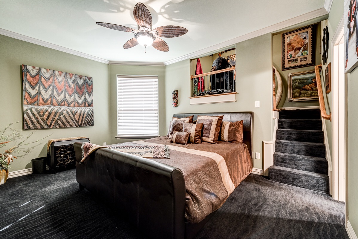 This is one of the three bedrooms located on the second level. This particular bedroom overlooks the foyer with a Romeo and Juliet balcony and features a walk-in closet and attached full bathroom.