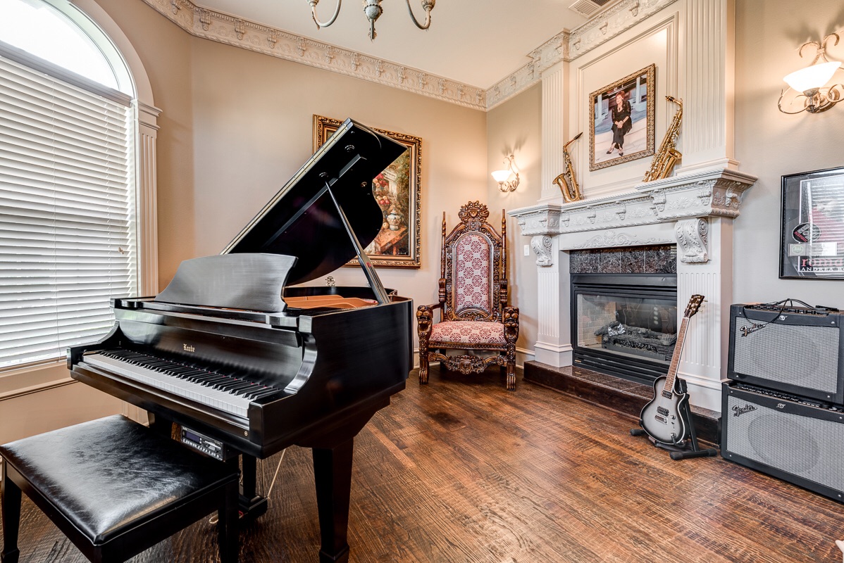 The Music Room (formal living room) is turret shaped at one end and has three windows. It shares a see-thru electric switched gas fireplace with the Study/Library. It features hand-scraped hardwoods, crown molding, base boards, a chandelier, and two wall sconces. Also note that most every light switch in the home has adjustable dimmers to control the amount of light in each room.