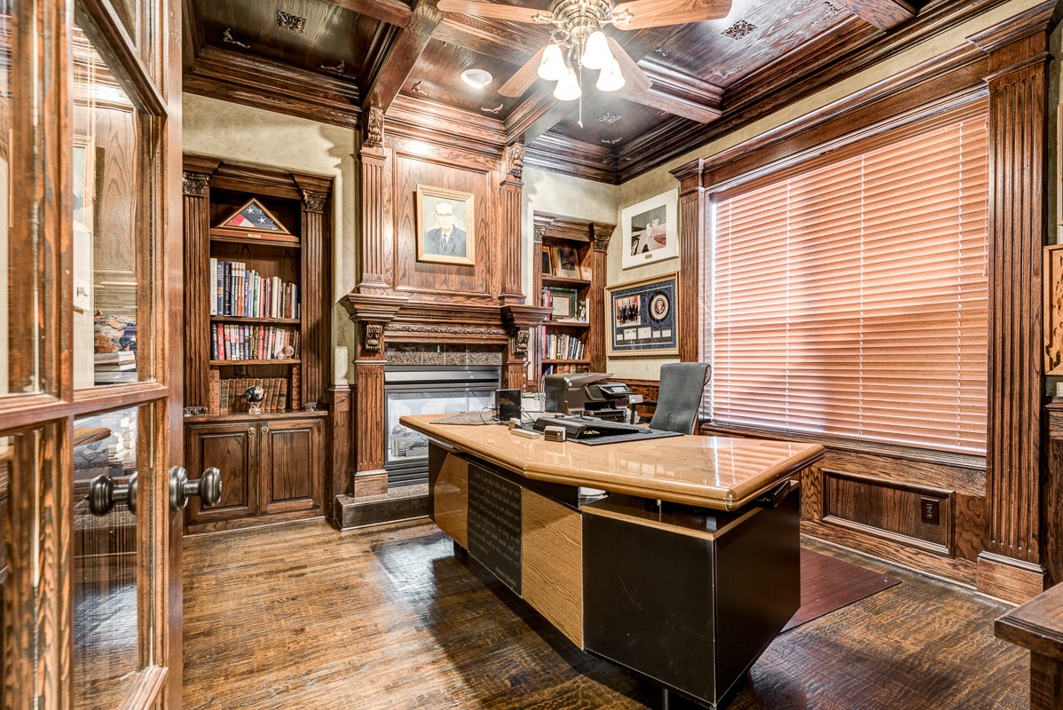 The Library/Study (currently being used as a home office) has built-in bookshelves, custom wood coffered ceilings, crown molding, base boards, ceiling fan, a built-in desk with cabinets, opposing upper and lower cabinets with extra counter space, and a double-sided see-thru fireplace that looks into the Music Room (formal living room).