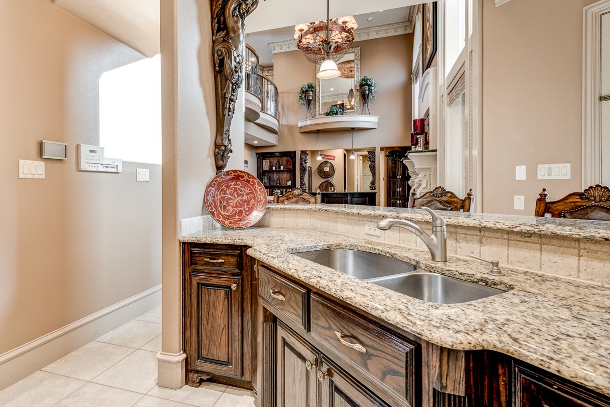 The Kitchen features large counter spaces and plenty of storage cabinets, coffee bar area, roll-top bread pantry, butler’s pantry with lighted built-in storage cabinets, granite counter top, and a stainless steel sink for joint access to the Kitchen and Formal Dining Room. Opposing the butler’s pantry is a full-size walk-in pantry with water lines hook-ups for an additional refrigerator/freezer.