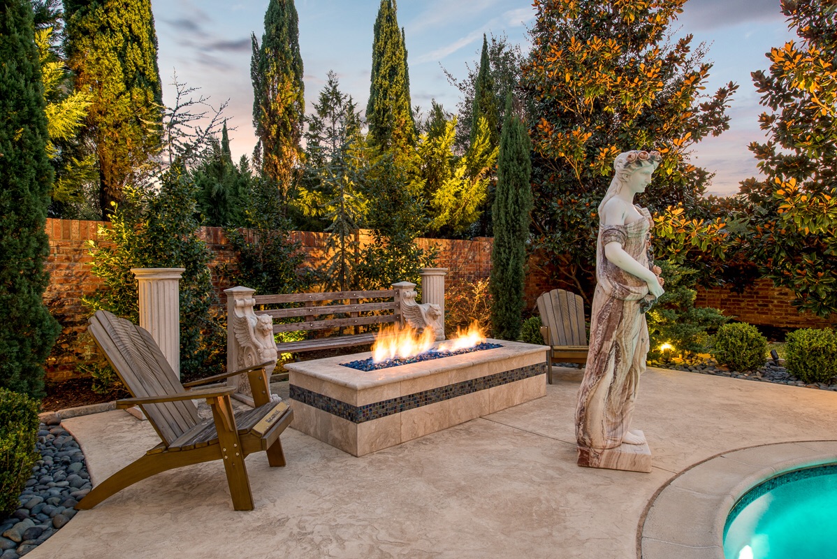 The Backyard has many gardens, privacy trees and pathways that are lit by beautiful landscape lighting. An intricate sprinkler system and French drains help to maintain these beautiful giants and all of the seasonal landscaping that blooms multiple times throughout the year.