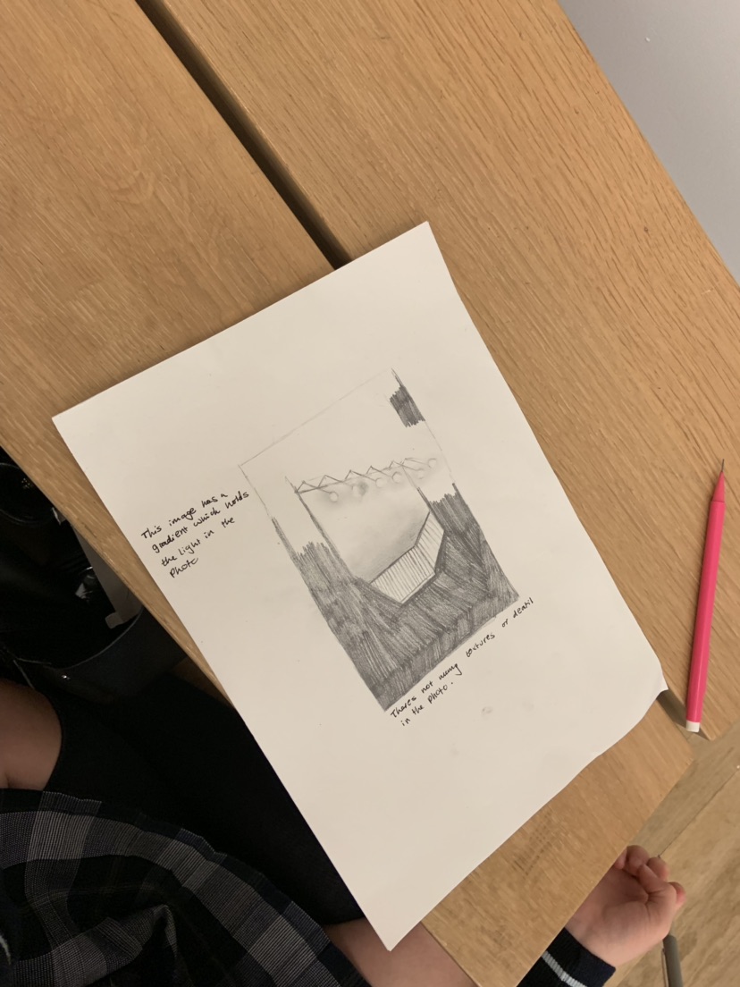 All students were set a task to reflect on two of the images and use drawing and literacy skills in order discuss their personal reflections and reactions. When talking about images we learn to use Ways In. This is a system that helps to scaffold our text in important sections called; personal-object-subject-context.
